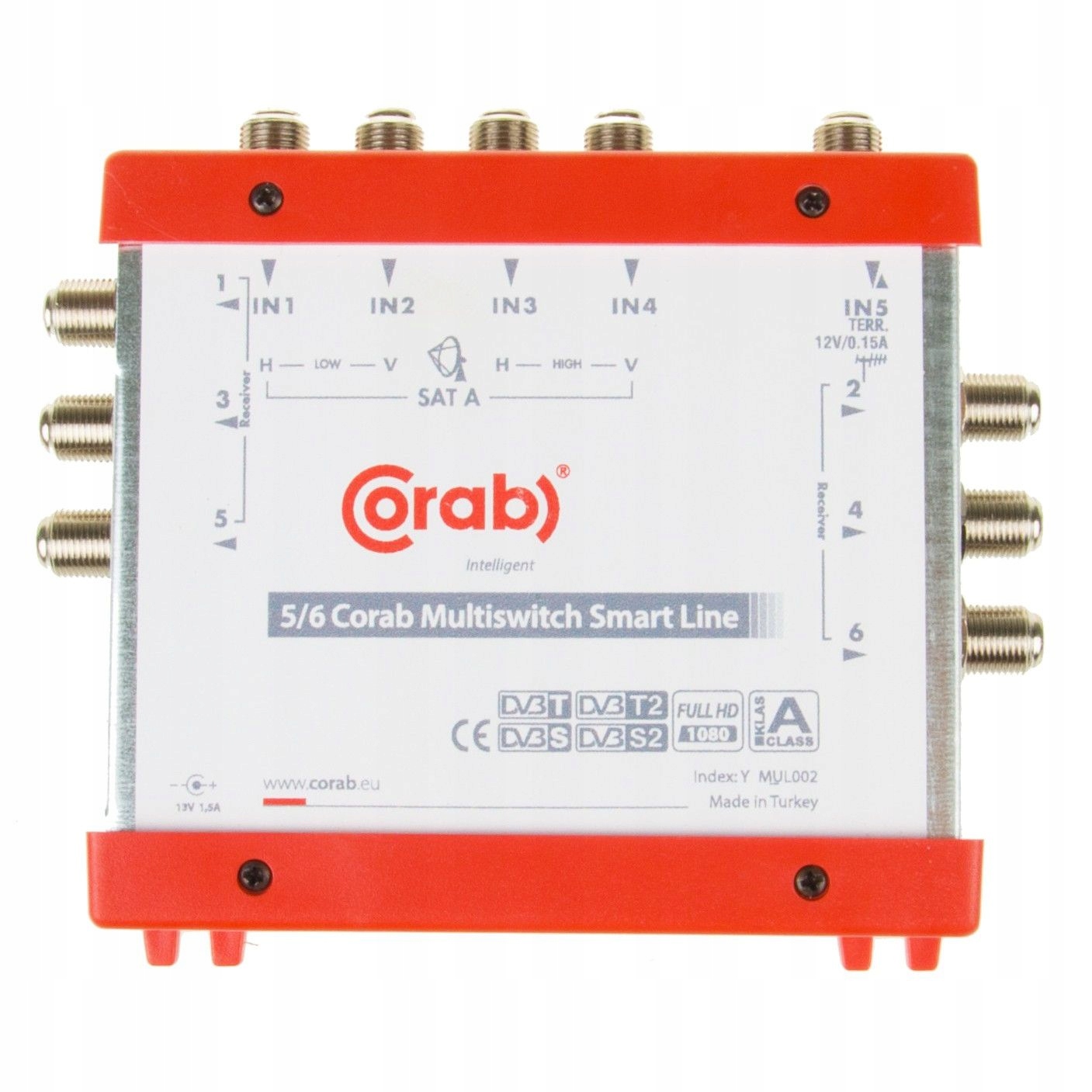Мультиперемикач Corab 5/6 Smart Line із 4 супутниковими входами для одного конвертора Quattro LNB та 1 входом від антени наземного телебачення (DVB- T ) дозволяє поширювати сигнал на 6 абонентських розеток SAT TV (розетки є в нашій пропозиції).