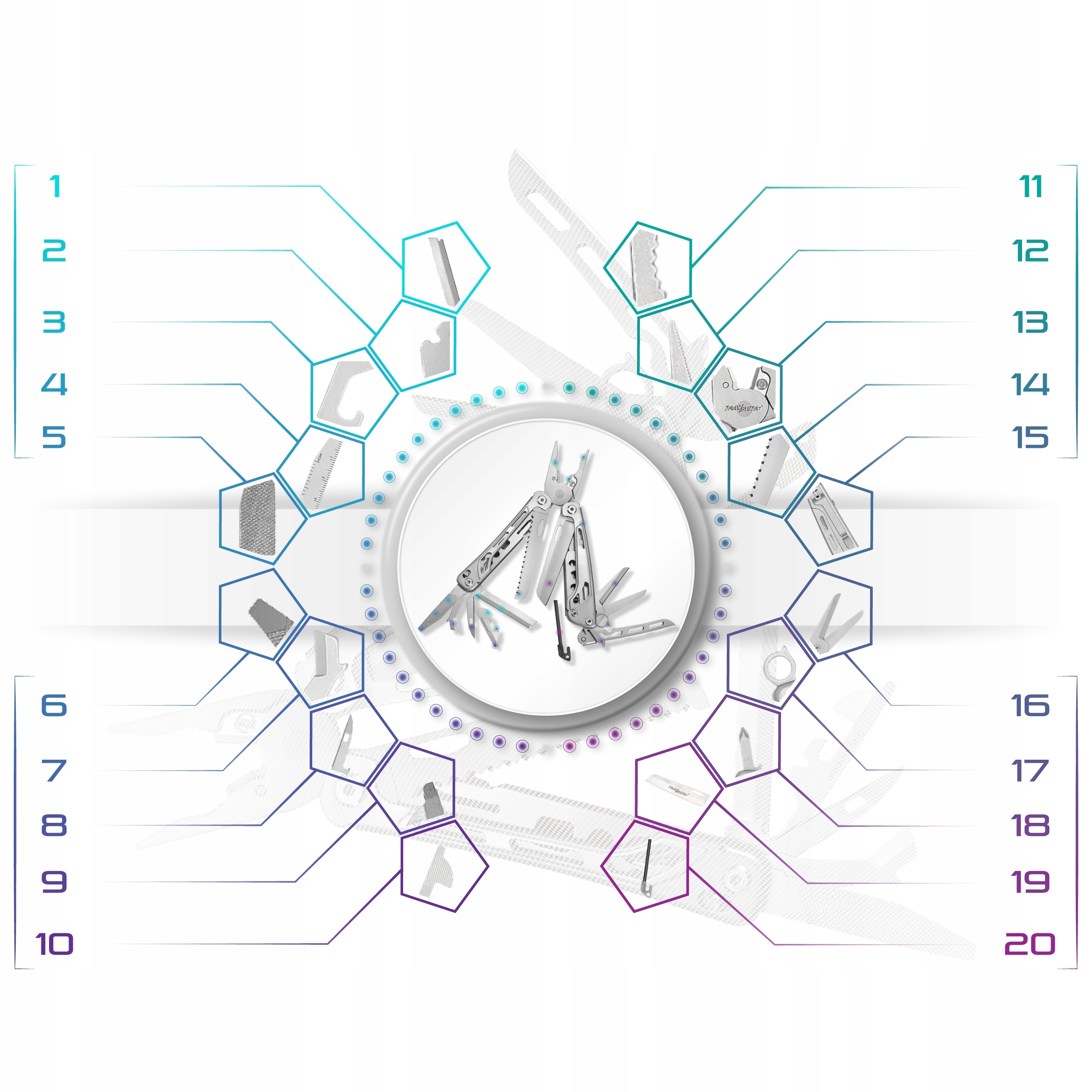 Чи чули ви про щось подібне? Комплект EDC – це буквально комплект, який носять щодня. Він складається з предметів, необхідних у повсякденному житті, а також тих, які полегшать виживання в складних умовах. Для людей, які пакують рюкзаки EDC, найважливішим є функціональність обраних інструментів у поєднанні з їх невеликою вагою та невеликими розмірами. Мультитул 20 в 1 ідеально відповідає цьому визначенню. Він має багато застосувань і в складеному вигляді не займає багато місця. Якщо ви не носите рюкзак EDC, тому що хочете мати все необхідне під рукою, все, що вам потрібно зробити, це прикріпити багатофункціональний інструмент до пояса або кишені.