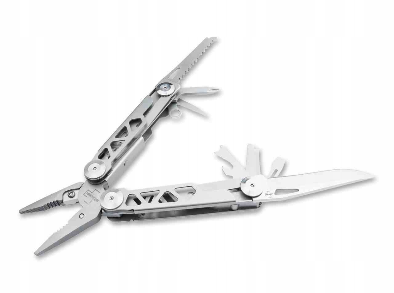 Оснащений різними практичними інструментами, Boker Plus Specialist Pro — це універсальний багатофункціональний інструмент із пружинними плоскогубцями. Має посилений змінний різак для дроту і витримує великі навантаження. На додаток до плоскої поверхні захвату, кліщі також мають так званий отвір для пальника для захоплення шестигранних гвинтів, накидних гайок і труб. Інструменти, розміщені в двох половинах ручки, плавно відкриваються і можуть використовуватися особливо безпечно завдяки надійному механізму блокування. Окрім кусачок, мультитул також містить гладке лезо, пилку по дереву, відкривачку для консервів, відкривачку для пляшок, згинач дроту, шило для свердління/шиття, хрестоподібну викрутку, плоску викрутку та металевий напилок. Корпус ручки виготовлений з нержавіючої сталі і має декоративні вирізи. У набір входить отвір для шнурка, затискач і високоякісний нейлоновий чохол для ременя.