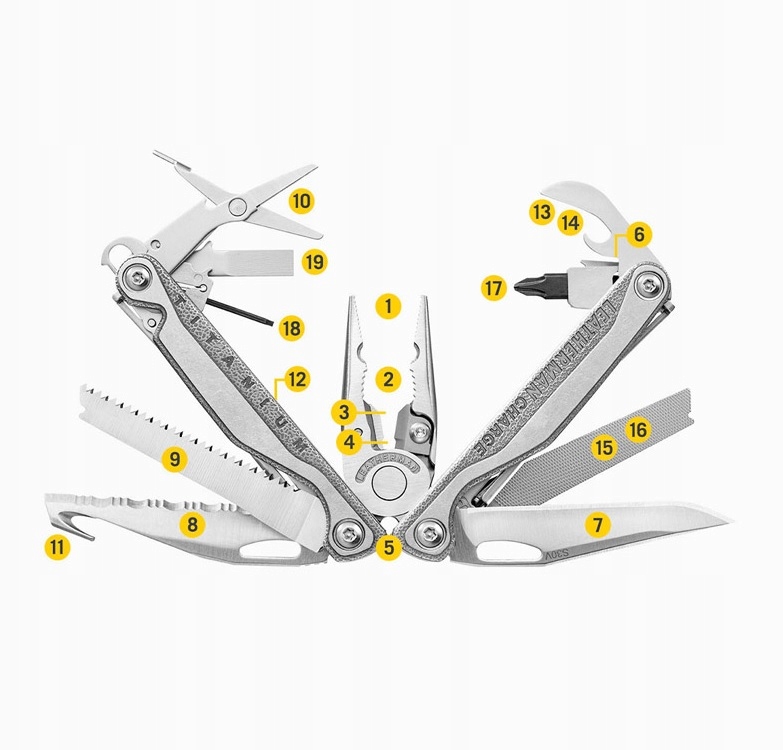 Лезо ножа гладке, лезо ножа зубчасте, пилку та напилок можна відкрити, не розгортаючи плоскогубці. Завдяки отворам для великого пальця леза ножа можна швидко відкрити однією рукою. Згадані 4 інструменти замикаються за допомогою індивідуальних замків типу liner-lock, решта працюють із двома храповими замками, подібними до системи зворотного замка.