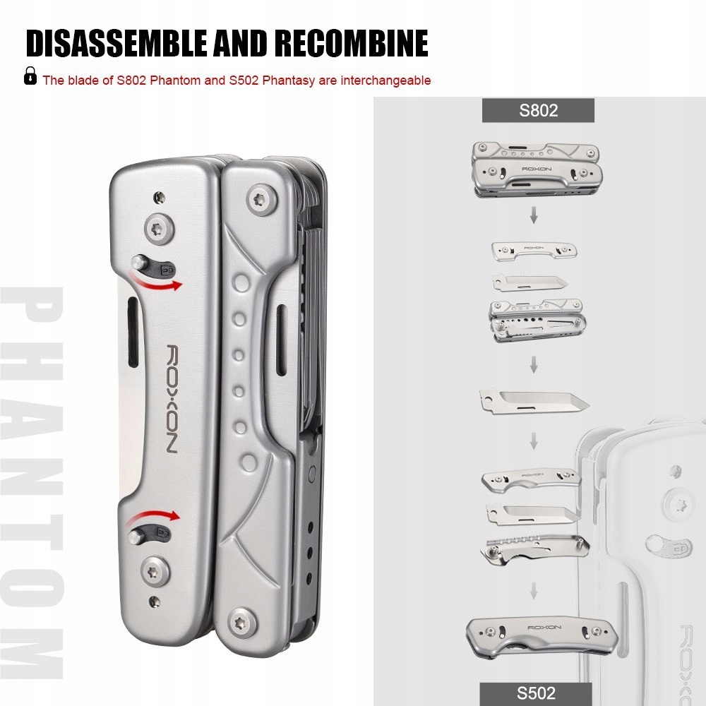 - Мультиінструмент Roxon S802 має змінне лезо ножа та різак для дроту. Лезо ножа можна замінити на інший тип леза для різних потреб. Оригінальне лезо S802 Phantom — American Tanto, якщо вам потрібні інші леза, придбайте їх окремо.
