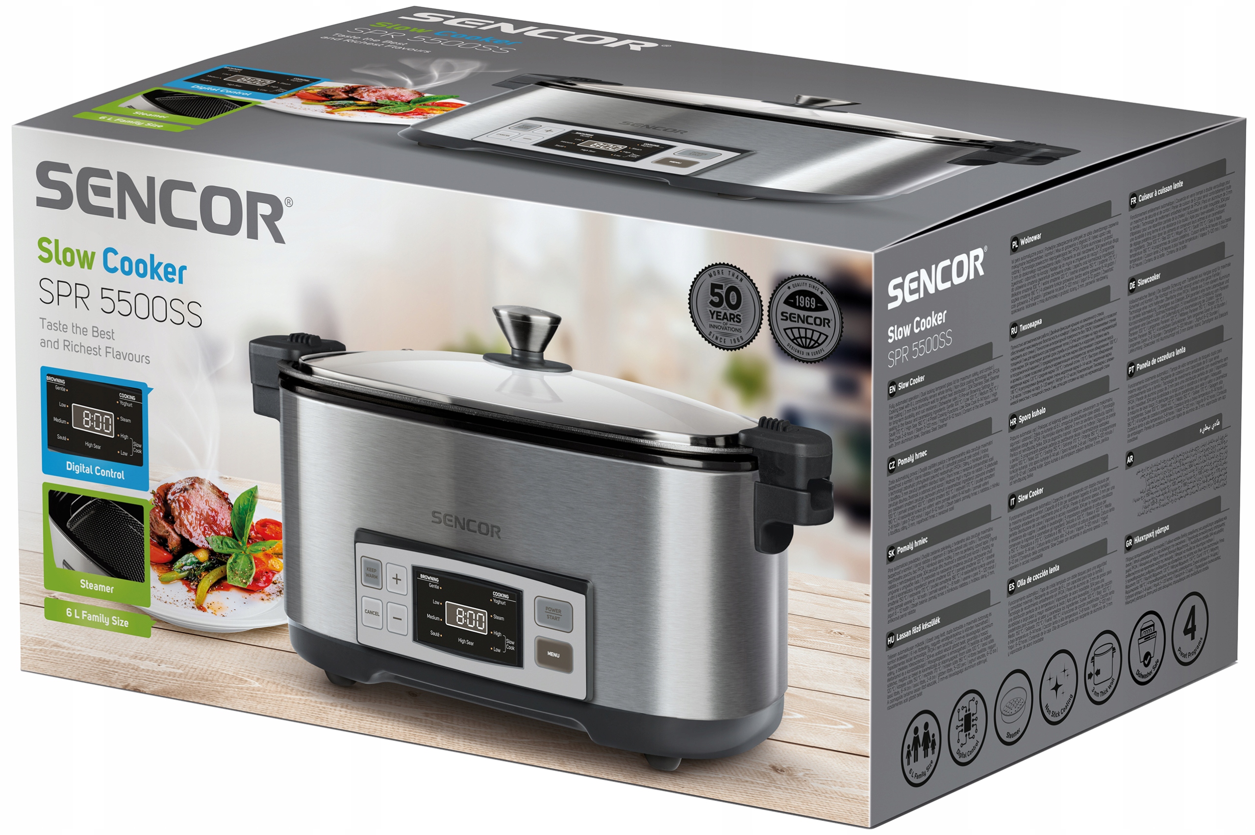 SPR5500SS Sencor - це електрична мультиварка, яка дозволяє готувати повільно завдяки використанню сучасних технологій. Завдяки такому способу приготування їжа зберігає смак і аромат, а також багато поживних цінностей. Готується здорово, без необхідності використання жиру. За допомогою цього багатофункціонального пристрою можна смажити, готувати на пару або традиційним способом. Завдяки світлодіодному дисплею ви завжди маєте контроль над приготуванням їжі, а налаштування відповідних функцій дуже просте.