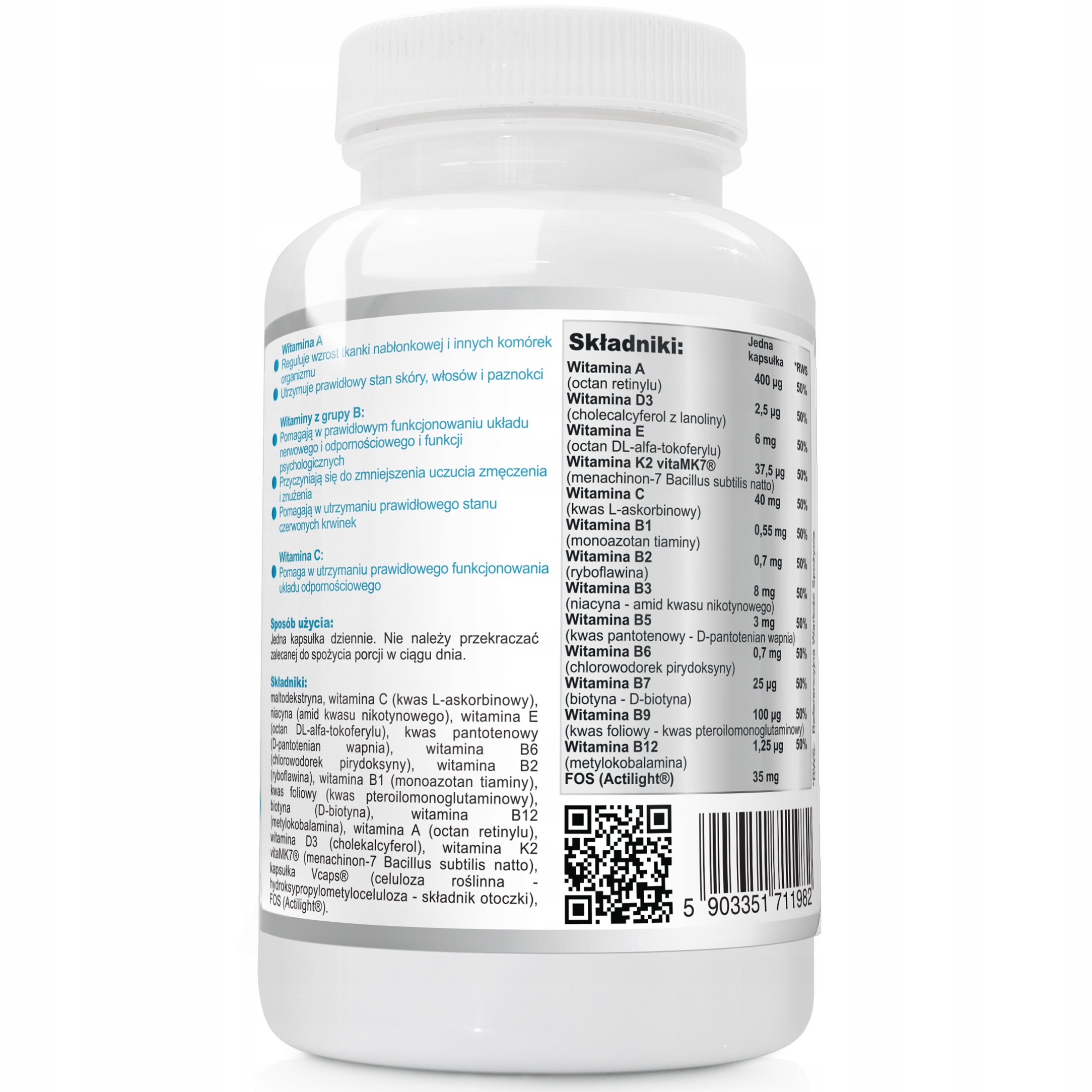 СКЛАД: мальтодекстрин, вітамін С (L-аскорбінова кислота), ніацин (нікотинамід), вітамін Е (DL-альфа-токоферилацетат), пантотенова кислота (кальцію D-пантотенат), вітамін B6 (піридоксину гідрохлорид), вітамін B2 (рибофлавін), вітамін B1 (тіаміну мононітрат), фолієва кислота (птероилмоноглутаминова кислота), біотин (D-біотин), вітамін B12 (метилкобаламін), вітамін A ( ретинілацетат), вітамін D3 (холекальциферол з ланоліну), вітамін K2 vitaMK7® (менахінон-7 Bacillus subtilis natto), рослинна капсула Vcaps® (гідроксипропілметилцелюлоза - компонент оболонки), FOS (Actilight®)