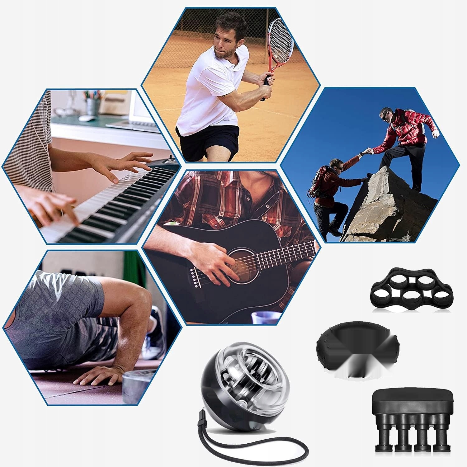 - Реабілітація та зменшення стресу: Повний ідеальний набір для людей, які хочуть покращити силу та стан м'язів передпліччя, зап’ястя та пальців. Ідеальний вибір для любителів альпінізму, тенісу та багатьох інших видів спорту, що вимагає спритності.