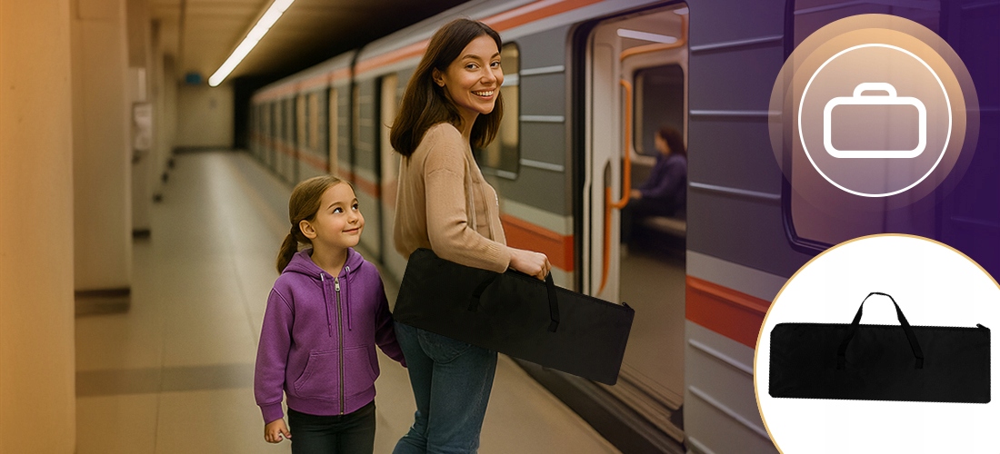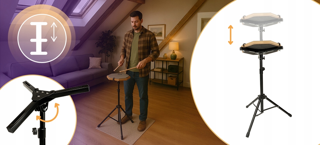 В набір входить стійкий штатив з регулюванням висоти від 48 до 80 см, що дозволяє зручно пристосуватися до положення сидячи або стоячи. Підкладка легка і її легко пакувати - чохол з ручкою в комплекті дозволяє легко переносити. Це робить PercuPad практичним компаньйоном для занять у студії, у музичній школі та під час подорожей. У набір також входять барабанні палички, що дозволяє приступати до тренувань відразу після розпакування.