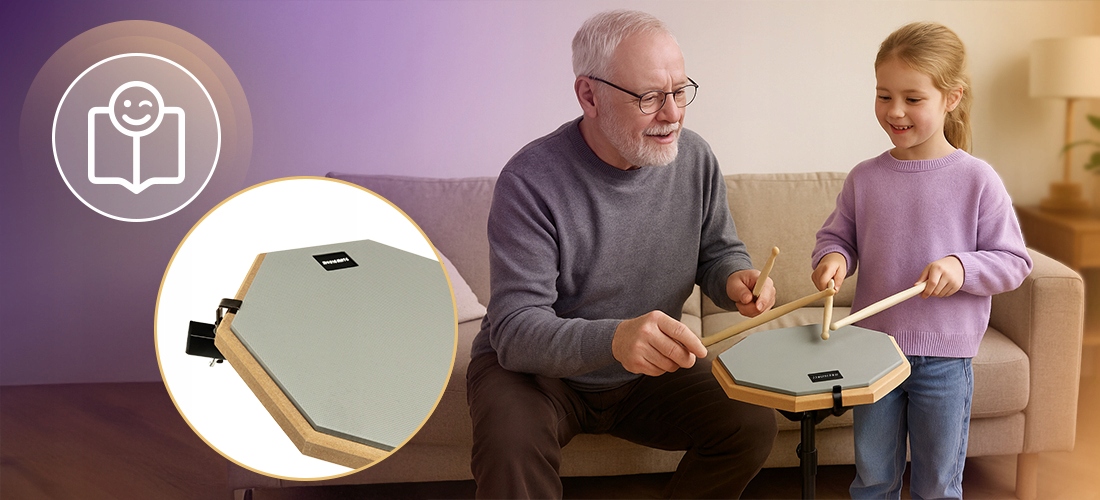 Тиха барабанна поверхня дозволяє займатися вдома, в гуртожитку чи готелі, не ризикуючи порушити тишу. Відсутність гучного резонансу дозволяє зосередитися на динаміці, темпі і точності, не відволікаючи звуків. Завдяки цьому ви можете займатися в будь-який час доби, навіть пізно ввечері, без необхідності спеціально заглушати кімнату. Це свобода постійно розвивати навички, незалежно від місця та середовища.