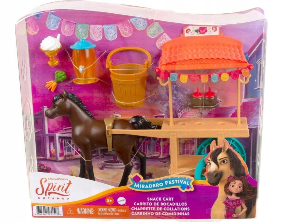 Ми представляємо чудовий набір від Mattel, з яку ви перенесете у світ дивовижних пригод. Жоден фанат серії Spirit не пройде повз нього байдужим. Ось чарівний набір із фігуркою коня та святковою підставкою. Багатий набір стане чудовим доповненням до колекції ляльок та аксесуарів лінії Spirit. Що ми знайдемо в наборі? Це буде фігурка темно-коричневого коня з чорною гривою, а також велика мобільна підставка з дахом з фестивалю в Мірадеро. Підставку можна прикріпити до коня, який зможе тягнути її за собою. Ларьок має помаранчевий дах, великі сині кільця та декоративні гірлянди. У набір також входять красиві аксесуари - яблука в шоколаді, глечик для лимонаду, відерце, чашка для морозива, морква. Все це можна буде придбати на нашому стенді під час фестивалю в Мірадеро. Рухома підставка і фігурка коня чудово поповнять колекцію ляльок і наборів з лінійки Spirit і дозволять створювати абсолютно нові, цікаві історії з улюбленими героями. Іграшка для дітей старше 3-х років.