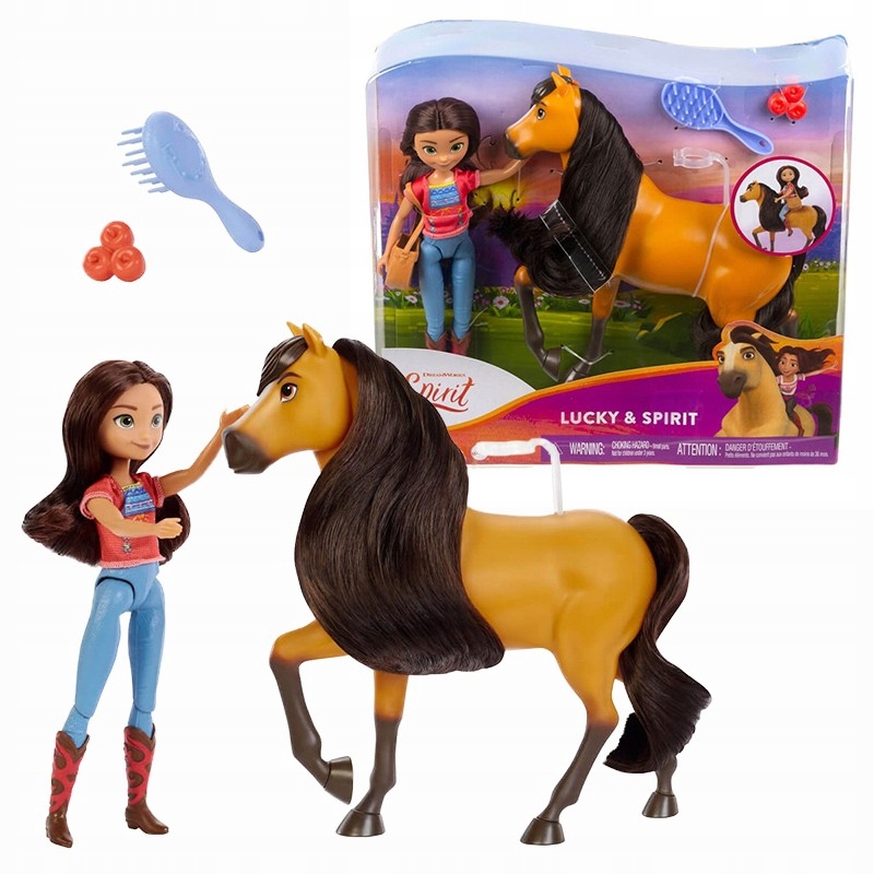 Відчуйте атмосферу дружби, відваги та пригод, відому з анімації DreamWorks «Мустанг: Дух свободи»! Лялька Лакі (приблизно 17,5 см) та її улюблений кінь Привид (приблизно 20 см) ідеально підходять для відтворення пригод, відомих із серії Мустанг. Лакі одягнена в джинси (пластикові), мамині туфлі та милу футболку з вишивкою. Завдяки 7 рухомим точкам ви можете встановлювати його в різні пози і грати більш динамічно. Привид має рухливу голову та динамічну позу для більшого задоволення, а також м’яку гриву, яку можна укладати. У набір також входить пензлик для укладання гриви, «яблука» для коня та сумка для ляльки. С-подібна ручка дозволяє Лакі сидіти на коні.