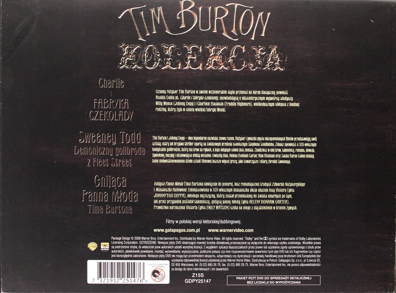 Найкращий пакет для шанувальників гумору та фантазійного стилю Тіма Бертона! Два імена світового рівня: Тім Бертон і Джонні Депп знову разом у своїх найдивовижніших фільмах. Доступна ексклюзивна колекція фільмів Тіма Бертона: «Чарлі та шоколадна фабрика», «Суїні Тодд: Демон-цирульник із Фліт-стріт», «Труп нареченої».