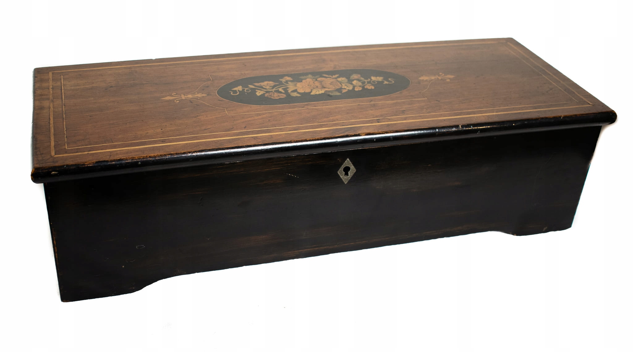 На кришці скрині інкрустований квітковий візерунок.