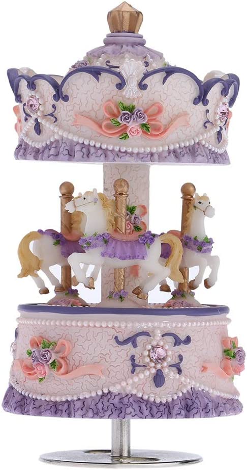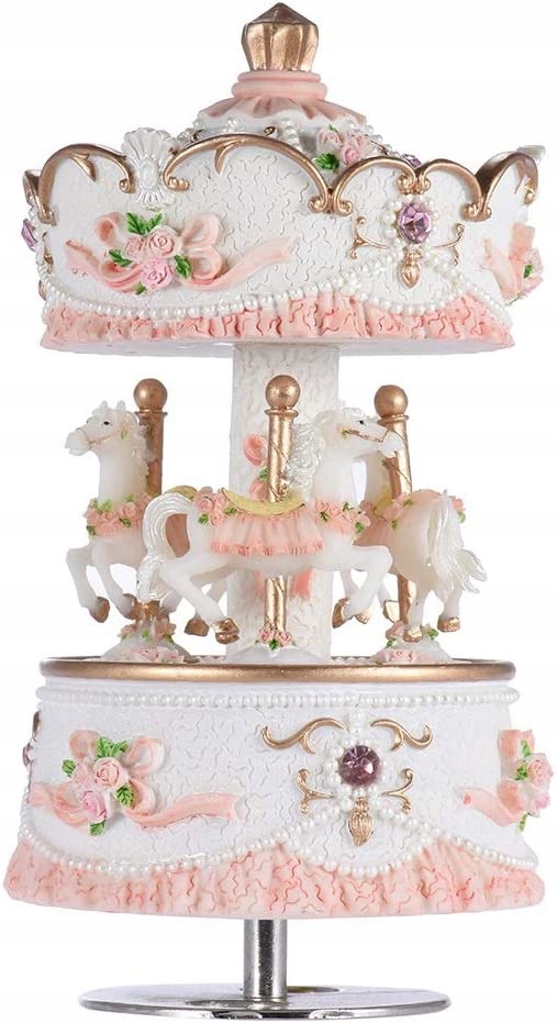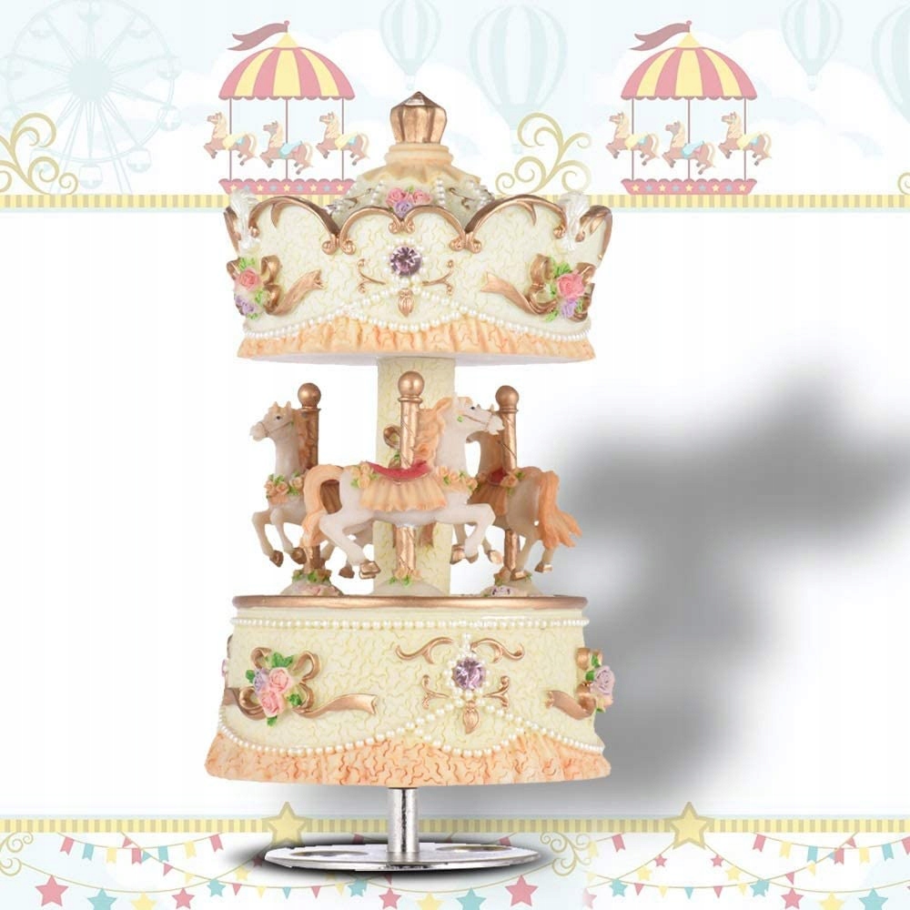 Музична шкатулка виготовлена з високоякісної синтетичної смоли з металевим механізмом. 3 коня можуть крутитися під музику. Гарне різьблення навколо корпусу скриньки. Мелодія - це замок у небі, сила якого - звуки весни. Використовуйте нижній гайковий ключ, щоб затягнути пружину, потім відпустіть і грайте. Чудова музична скринька для ваших друзів, дружини, коханих, родичів або собі на подарунок.