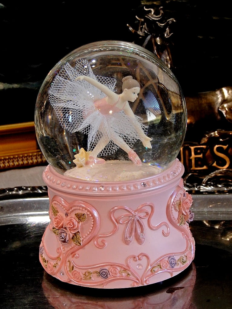 У ній гарна балерина, яка крутиться, коли музичну шкатулку ввімкнути, а коли її потрясти, з’являється «сніг», прозорі пластівці.
