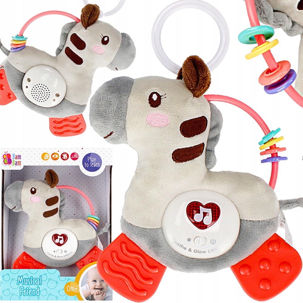 На півколі на спині зебри нанизано 4 різнокольорові кільця, які видають делікатні, брязкітливі звуки при струшуванні.