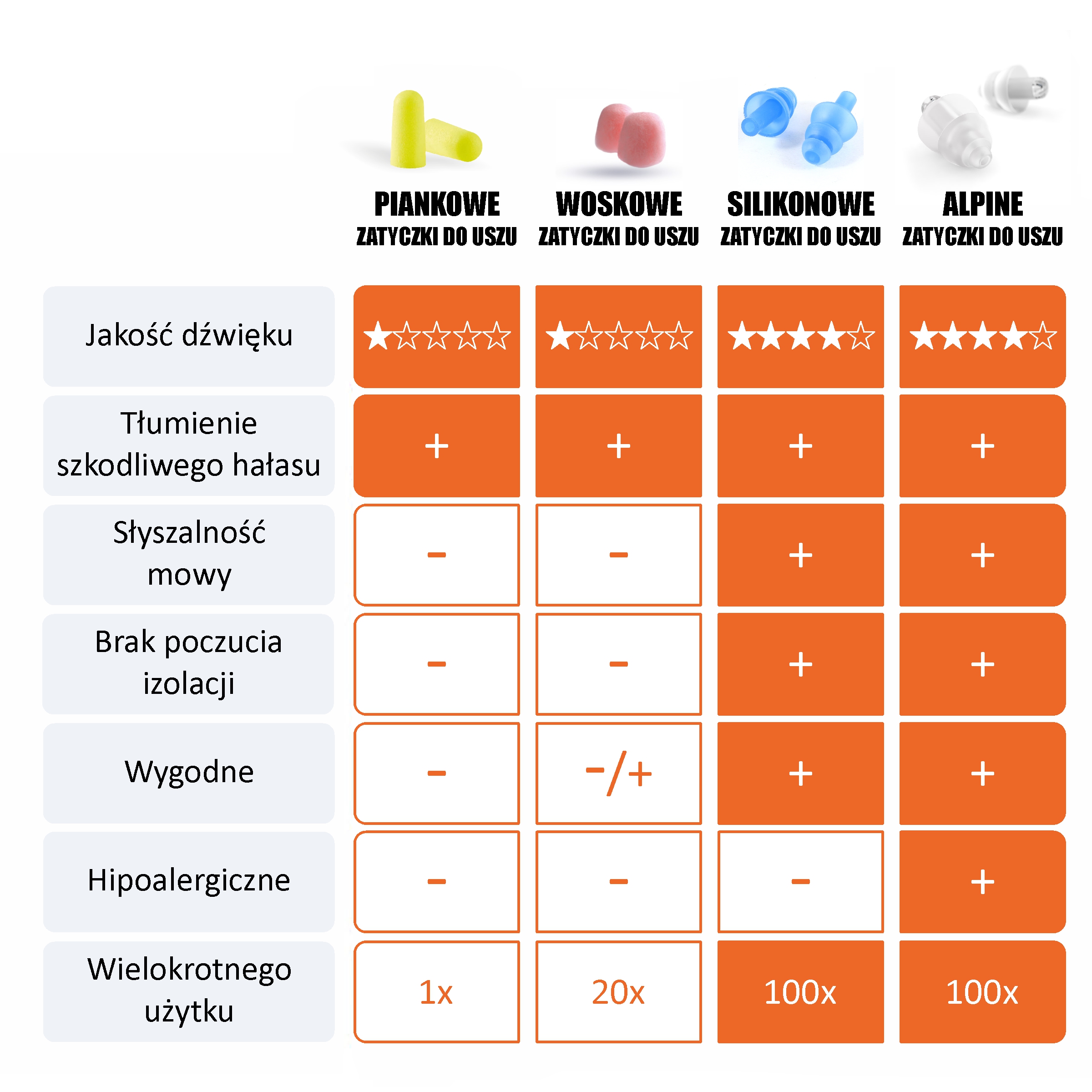 Завдяки тому, що беруші вставляються глибоко у слуховий прохід, вони є гігієнічними. продуктів. Вони доставляються в запаяній упаковці та відповідно до ст. 38 Закону про права споживачів не повертається.