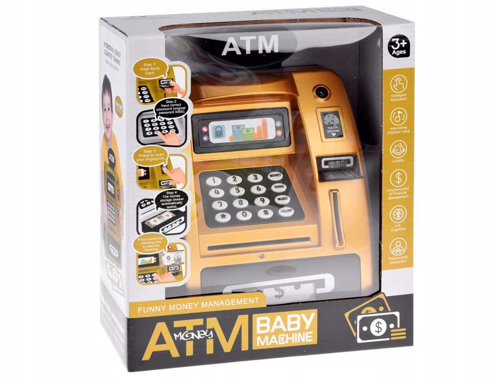 - Банк -скарбнички допоможе вам заощадити дітей трохи грошей на невеликі витрати. Банкомат був повністю виготовлений з пластику з увагою до деталей красивого золота чорних кольорів. Він має звукові та світлові функції. Пластикова кредитна картка включена в набір. Монети кидають через проміжок поруч із кнопками, тоді як банкноти протягуються відразу після вставки в проміжок для оплати грошей.