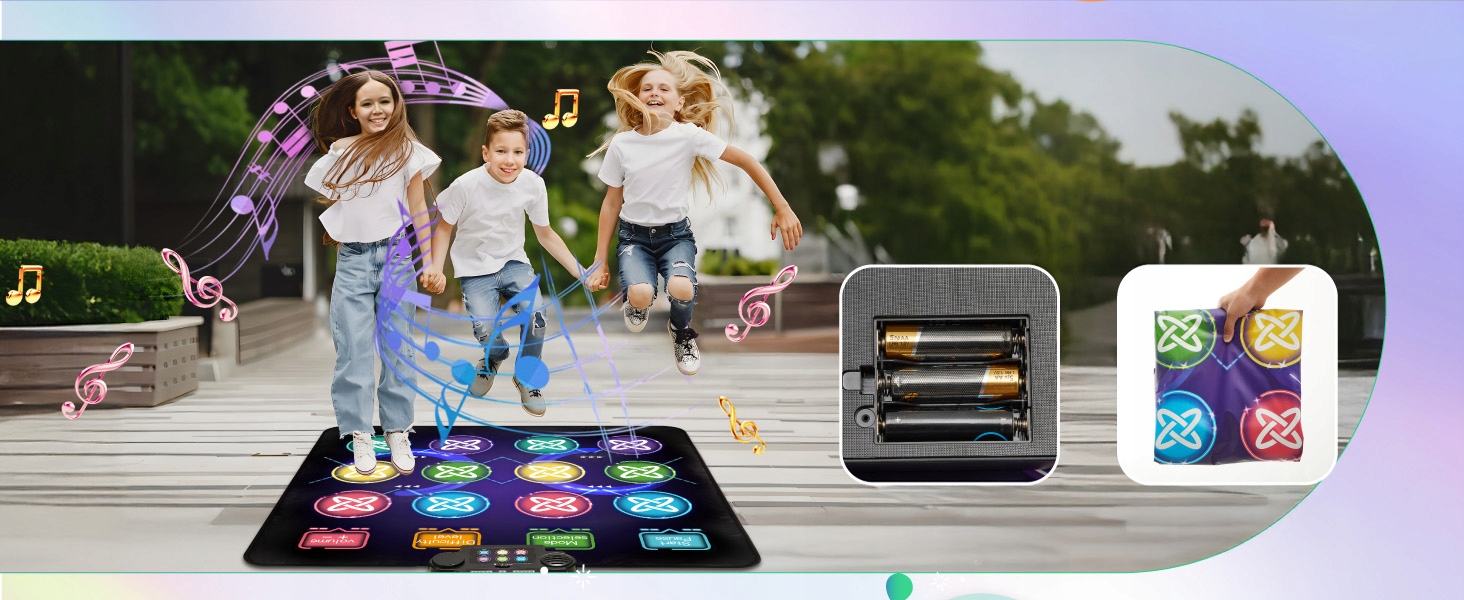 Танцювальний килимок поєднує в собі фітнес, навчання та сміх в одній компактній упаковці! У вас немає батарейок? Немає проблем - живлення від 3 батарейок АА (не входять в комплект). Він перетворює будь-яке приміщення на танцювальну студію. РУХАЙТЕСЯ: покращуйте координацію, витрачайте енергію та створюйте незабутні спогади з кожним кроком!
