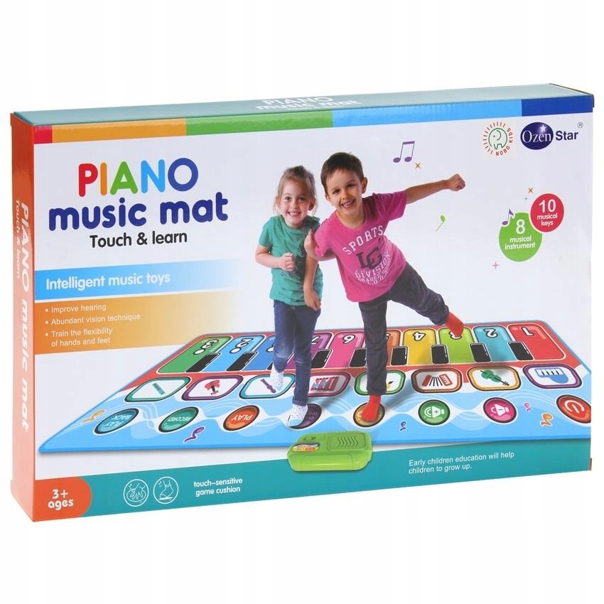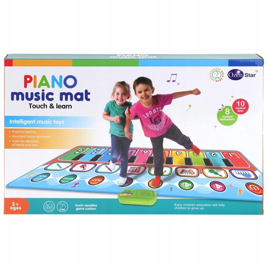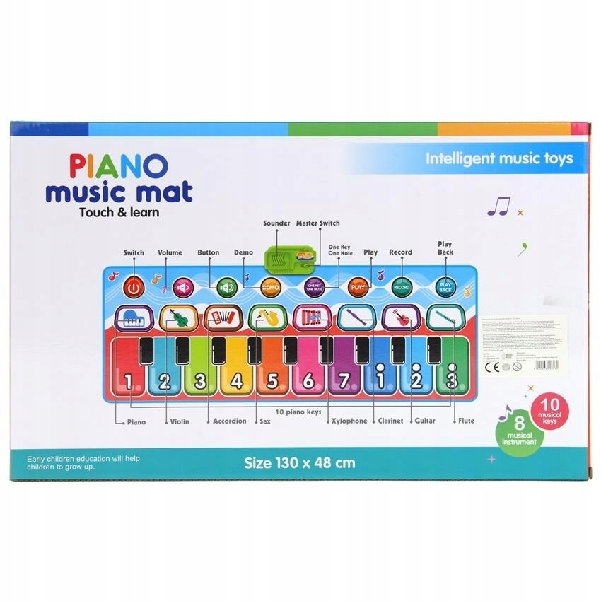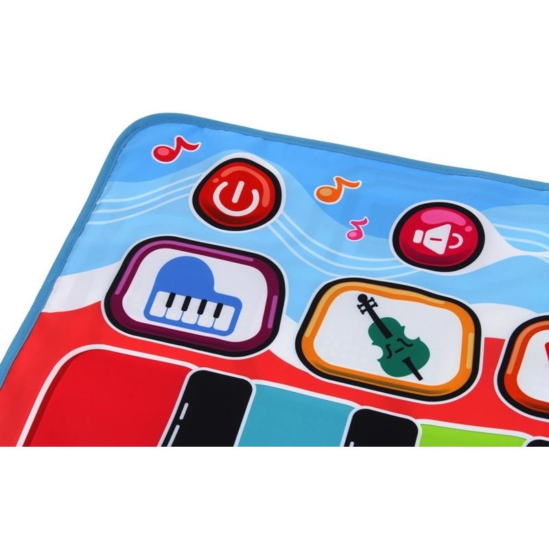 Це піаніно викликає бажання грати й танцювати. Після включення вас зустріне весела мелодія. Всі клавіші та значки на килимку активуються натисканням. Ця чудова музично-рухлива гра дозволяє вам грати під мелодії, які ви склали. Ми можемо записати мелодію за допомогою кнопки «ЗАПИС» і відтворювати її повторно завдяки кнопці біля «ВІДТВОРЕННЯ». Крім того, іграшка має градуйований регулятор гучності. Записана раніше мелодія зникає з пам'яті при виключенні іграшки. Зверху, посередині килимка, прикріплена зелена коробочка, в якій знаходиться динамік і додаткова функція вмикання та вимикання іграшки. Завдяки інтерактивному килимку дитина має можливість ознайомитися з основними звуками та ритмами, а різноманітність мелодій та можливостей музикування може вплинути на розвиток художніх навичок. Електронний музичний блок може стимулювати розвиток слуху дітей, допомагати розпізнавати кольори, цифри та інструменти. Килимок обов'язково принесе багато радості та розваги багатьом дітям.