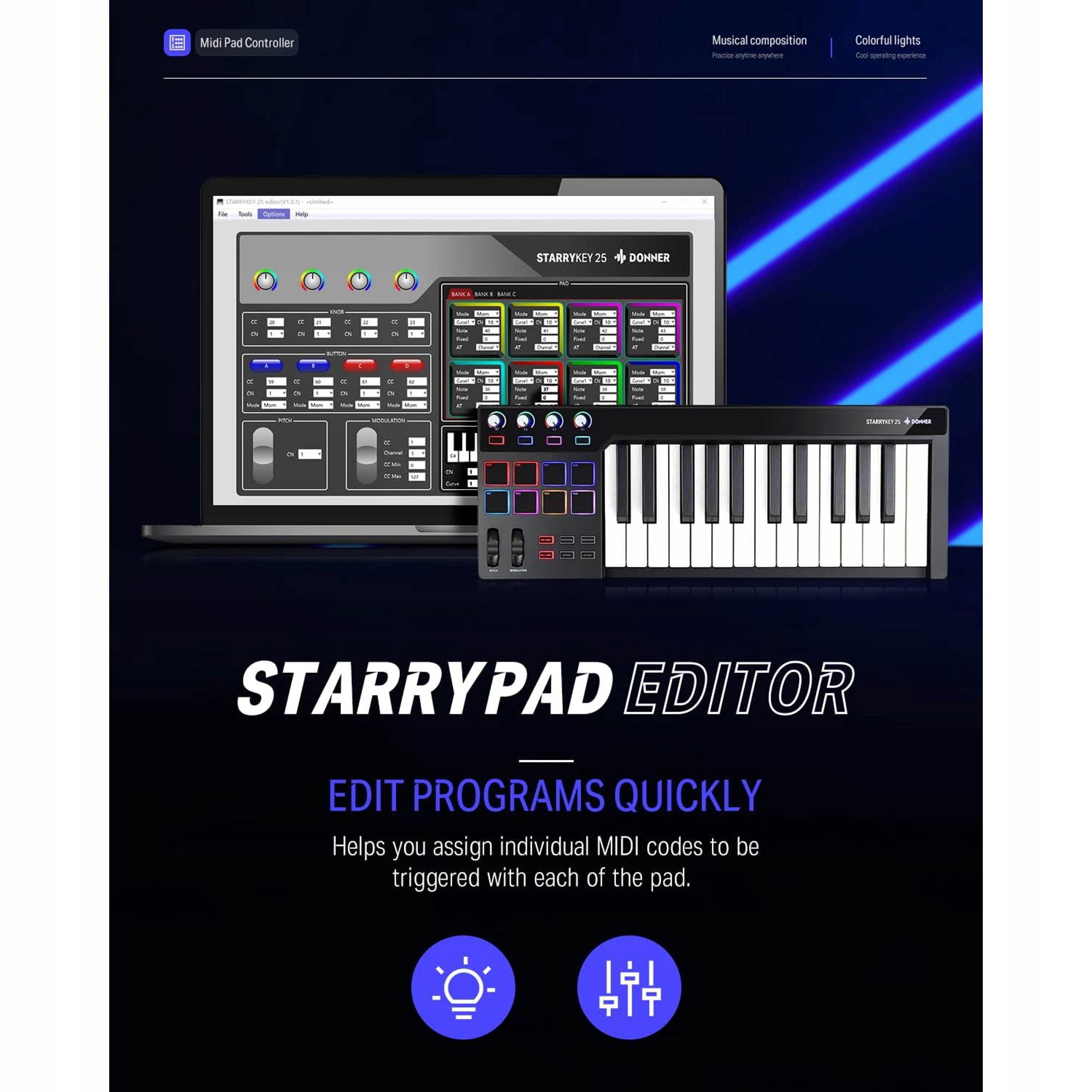 DONNER D-25 освітлює сцену сімома яскравими кольорами. Використовуйте інструкції щодо відтворення, щоб увімкнути яскраве світло або налаштувати кольори за допомогою програмного забезпечення, що входить у комплект. Нехай світло подвоює ваш ритм або використовуйте його, щоб контролювати атмосферу на танцювальному майданчику.