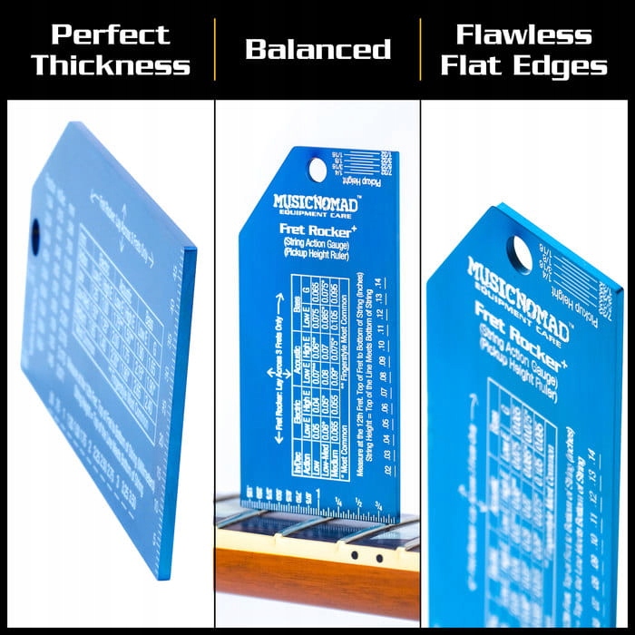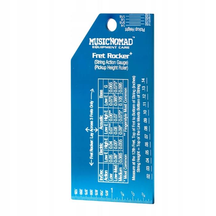 Rocker FRET містить точний показник струнної дії та лінію висоти пікапа в дюймах та метрах, які легко читати завдяки синій обробці та глибоко травлених білих маркувань. Зручна таблиця правильної висоти відповідно до типу інструменту та інструкцій вимірювання усуває здогадки. Правильний правитель допомагає ще краще налаштувати звук.