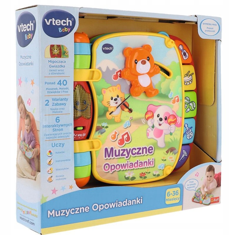 Інтерактивна книга має 2 варіанти гри: навчання та мелодії. Книга польськомовна. Він містить понад 40 пісень, мелодій, звуків і фраз. Допомагає вивчити кольори, інструменти, віршики, розвиває моторику. Мерехтлива зірка світиться звуками та 6 інтерактивних сторінок із чарівними казками та віршами. Сторінки легко гортати маленькими ручками. Зручне керування гучністю та автоматичне вимкнення.