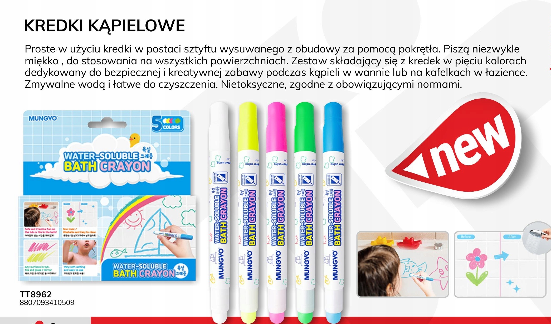 Оплачивая «MWBC-5A КРЕЙДИ ДЛЯ КУПАННЯ 5 КОЛЬОРІВ MUNGYO», вы можете быть уверены, что данный товар из каталога «Водные игрушки» будет доставлен из Польши и проверен на целостность. В цене товара, указанной на сайте, учтена доставка из Польши. Внимание!!! Товары для Евросоюза, согласно законодательству стран Евросоюза, могут отличаться упаковкой или наполнением.