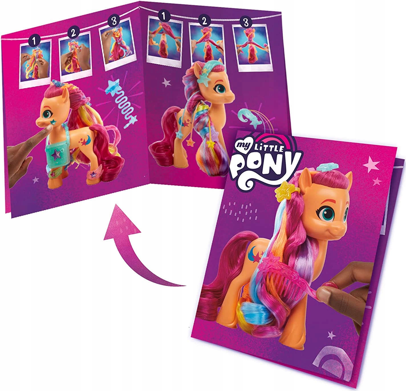 Sunny допитливий, азартний і сповнений рішучості змінити світ на краще. Поні має характерне рожеве волосся з різнокольоровими відблисками. Діти можуть розчісувати її довге м'яке волосся гребінцем, що входить у комплект. У наборі 17 елементів для створення дивовижних стилів. Тут ви знайдете, серед іншого, пов’язку, запонки, браслет, сумку, наклейки та багато інших цікавих аксесуарів. З цим набором вам не набридне!