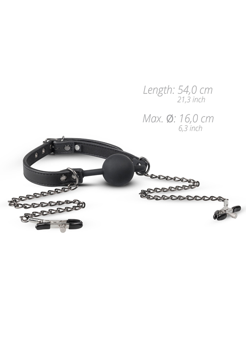 Кляп із затискачами для сосків. Ця чорна кляпка виготовлена з м'якого силікону. М'яч не має запаху та смаку, тому користувач може безтурботно насолоджуватися кляпом. Головний ремінь зі штучної шкіри регулюється, щоб забезпечити ідеальну посадку. Затискачі регулюються гвинтами з боків. Діаметр м'яча: 4 см