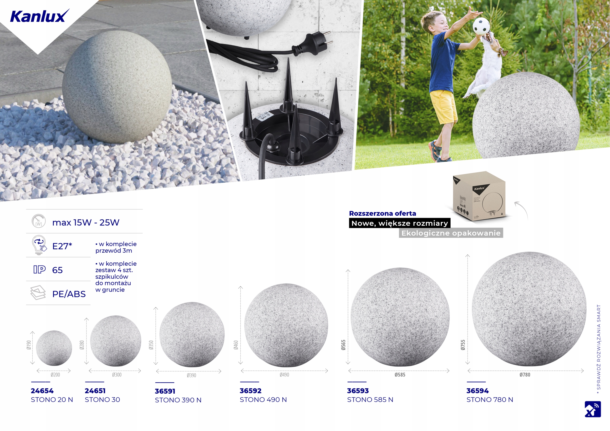 Цілком нова серія STONO садові світильники, являють собою світильники у формі кулі, що імітують гранітний камінь. Вони чудово впишуться в альпінарії або навколишні чагарники. Плоске дно дозволяє встановити світильник як на газон, так і, наприклад, на терасу, балкон або поверхню, вимощену бруківкою. STONO працює з усіма джерелами світла з цоколем Е27 будь-якої потужності і кольору світла. Світильники STONO включають чотири діаметри куль: 20 см, 30 см, 40 см і 50 см. Кожен з них оснащений основою, яка дозволяє вбудовувати світильник у землю. Цей світильник має високу стійкість до механічних пошкоджень та проникнення пилу та вологи завдяки класу герметичності IP44.