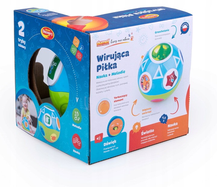 Іграшка розмовляє польською, вчить називати цифри та фігури, а також грає веселі мелодії та блимає вогниками.
