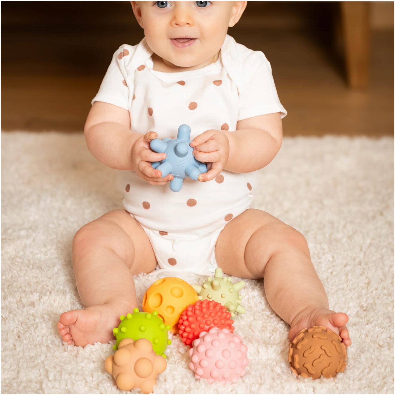 Сенсорні м'ячі - це не просто іграшки! Завдяки різноманітній текстурі вони підтримують розвиток моторики та чуття дитини. Масаж кульками сприяє розслабленню м'язів, що особливо важливо для немовлят. Ідеально підходить для повзання та прорізування зубів!