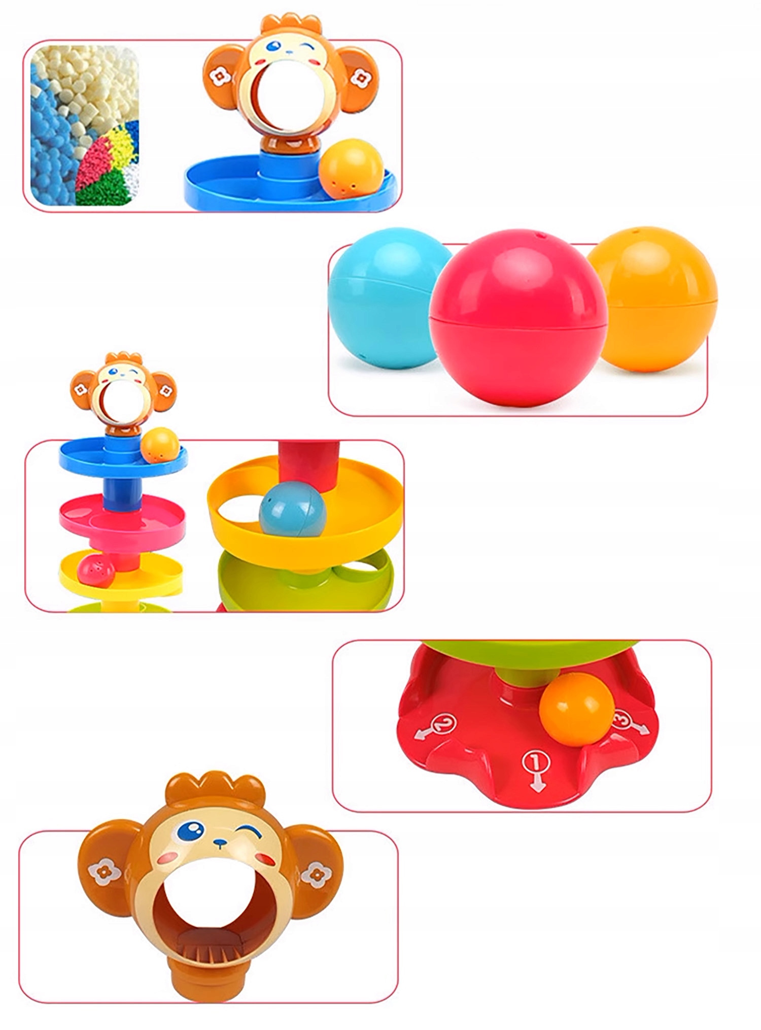 Гірка «Вежа» з кульками — це творча форма розваги для дітей b>. Дитина може схопити одну з трьох різнокольорових і брязкаючих кульок, а потім кинути її в рот мавпі. Куля котиться по вежі і випадає з одного з трьох виходів. Який вихід буде обраний цього разу? Сюрприз!