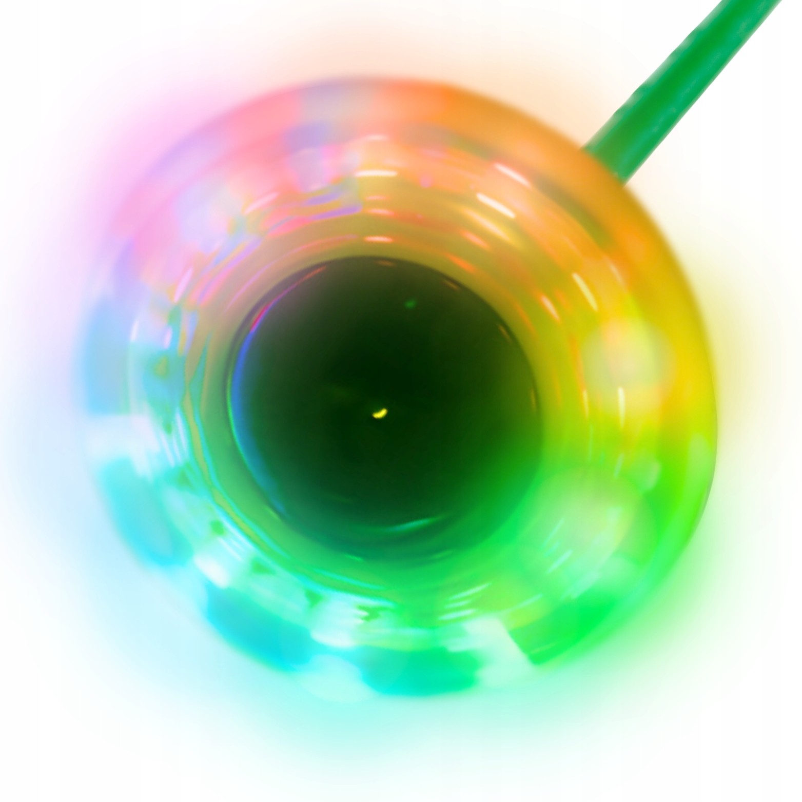 Конструкція: Іграшка розміщується на ніжці через знімне кільце, яке оточене м'яким протектором, тому ніщо не викликає дискомфорту під час використання, і вам не потрібно турбуватися про зайві потертості. На кінці гнучкої гумової мотузки є більш важкий гумовий елемент, який, завдяки законам фізики, дозволяє іграшці правильно обертатися. На цьому елементі також є закриті світлодіоди, які додають унікального шарму та приваблюють погляд, створюючи барвисту світлову оболонку навколо користувача. Що швидше мотузка обертається, то яскравіше світяться світлодіоди.
