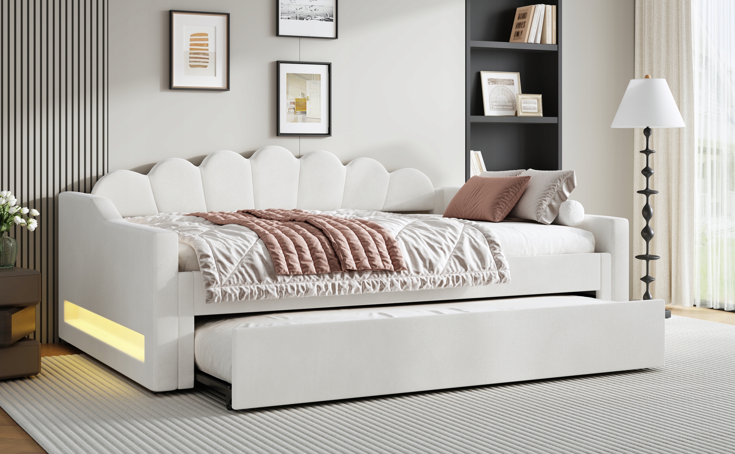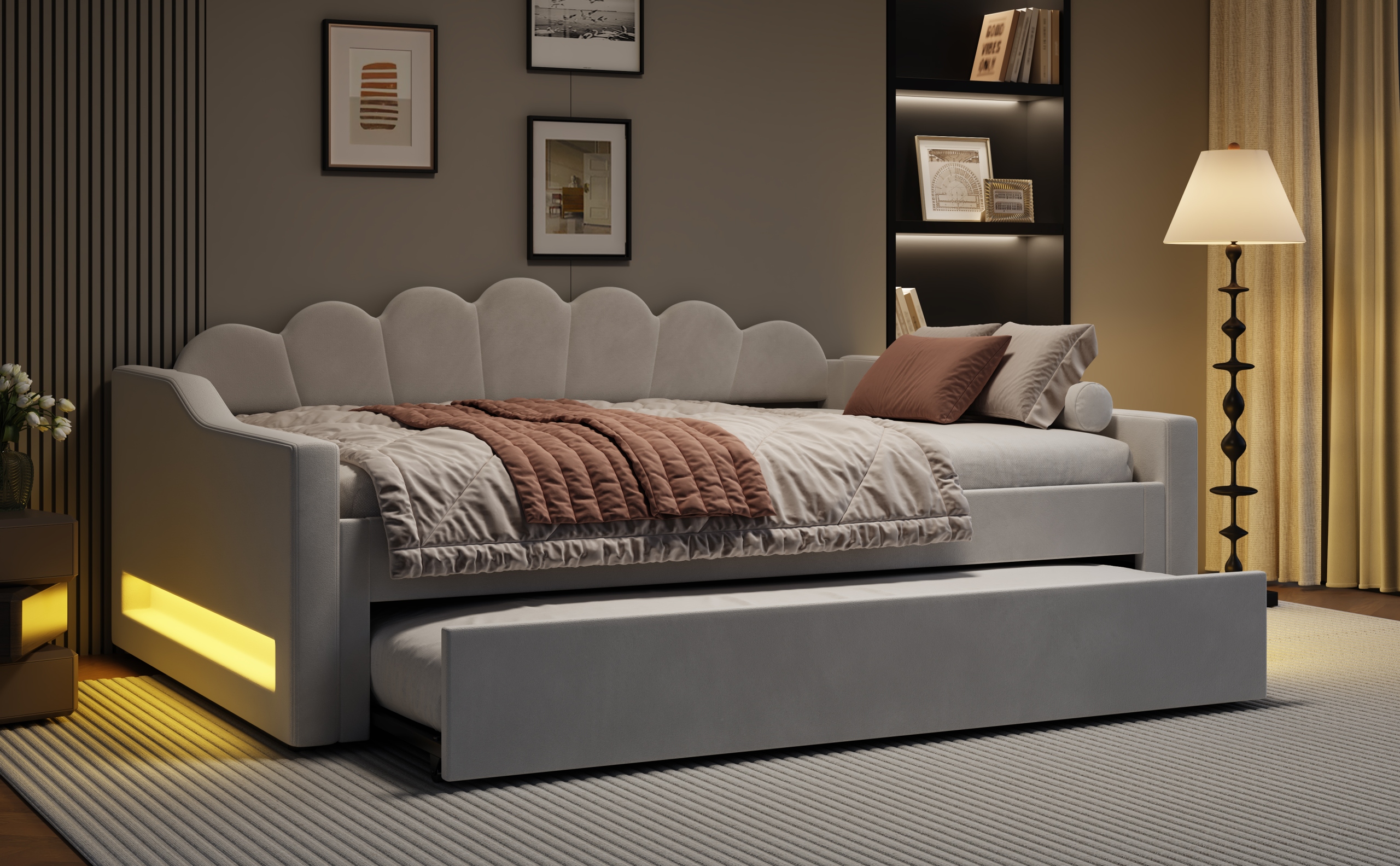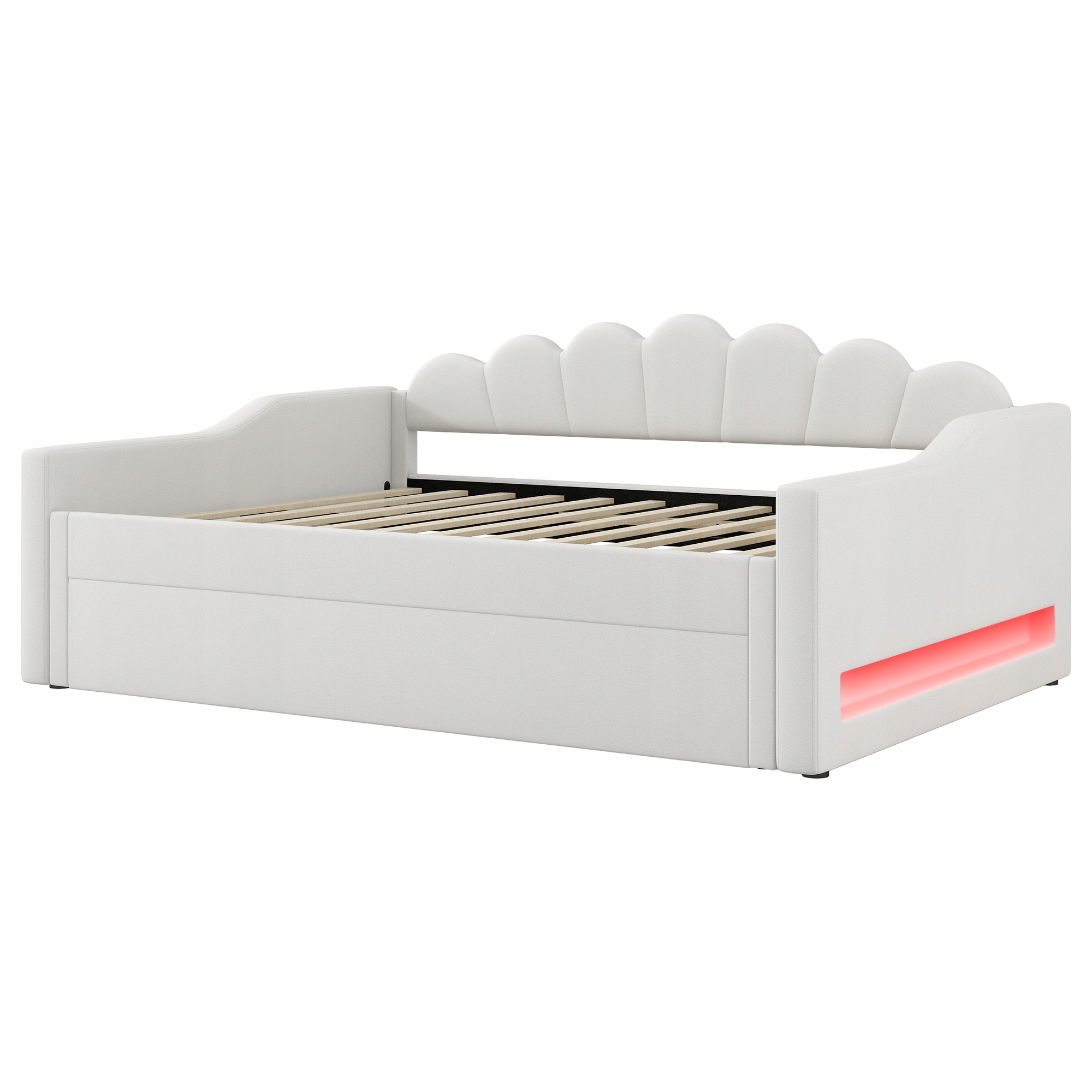 М’яке ліжко 140 x 200 см зі світлодіодною стрічкою та розкладним диваном, бежевий