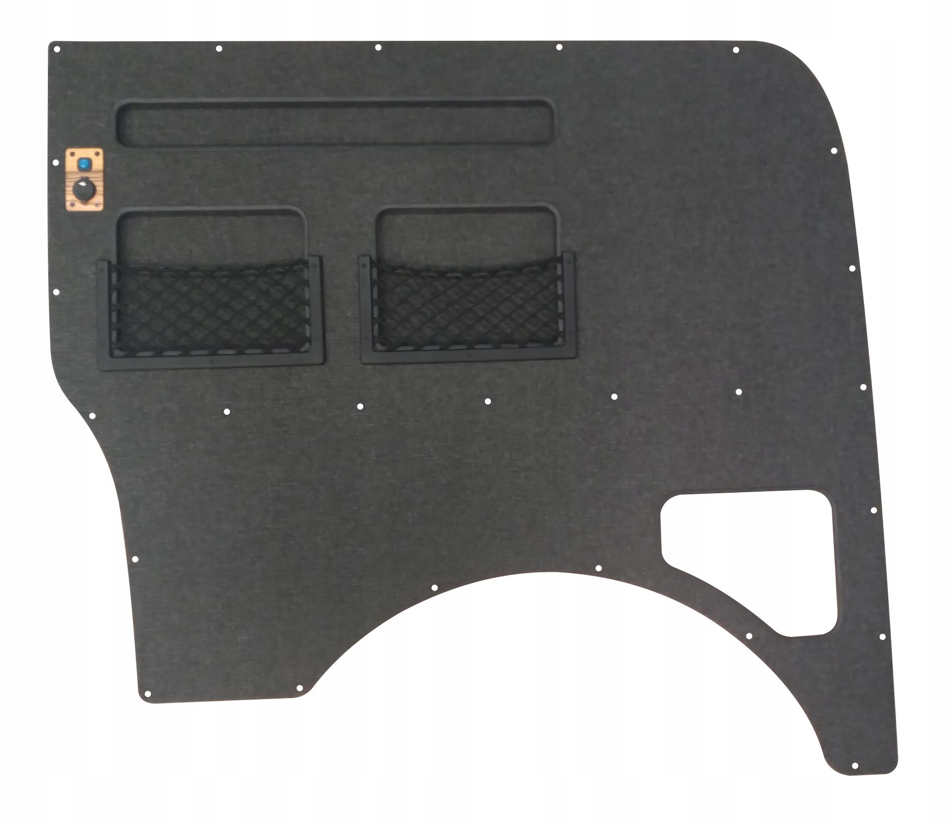 Стінова панель для фургона виготовлена за технологією ЧПУ, що забезпечує абсолютну точність і повторюваність. Для виробництва ми використовуємо ламіновані плити, ідентичні оригінальним, шпоновану фанеру, захищену високоякісною захисною глазур’ю, а також міцні та безпечні для користувача та навколишнього середовища оббивні матеріали з сертифікатом «OEKO-TEX Standard 100».