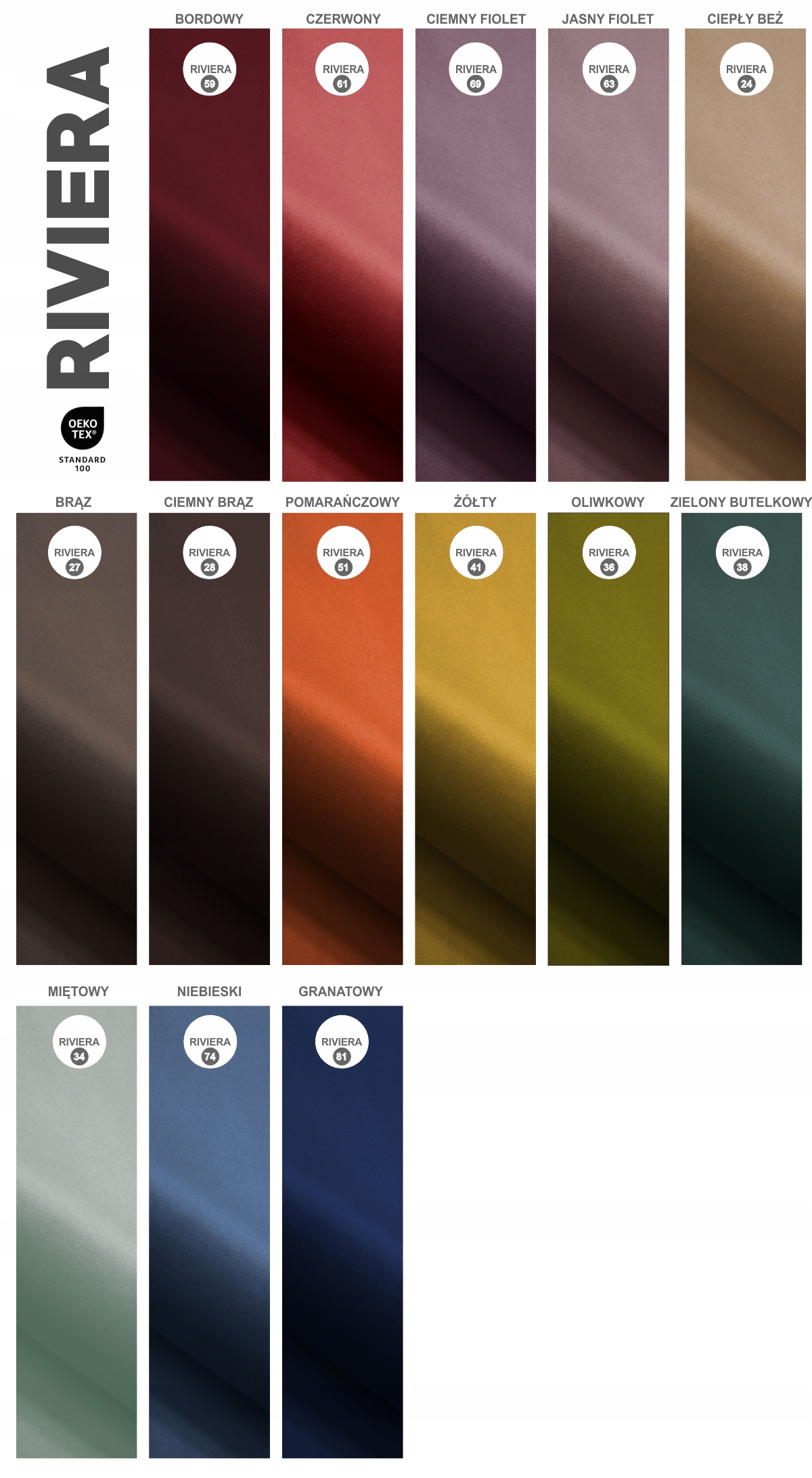 Riviera, як і Jasmin, до групи оксамитових тканин. Він затіняється при дотику і ніжно відбиває світло. Характеризується багатими характеристиками.