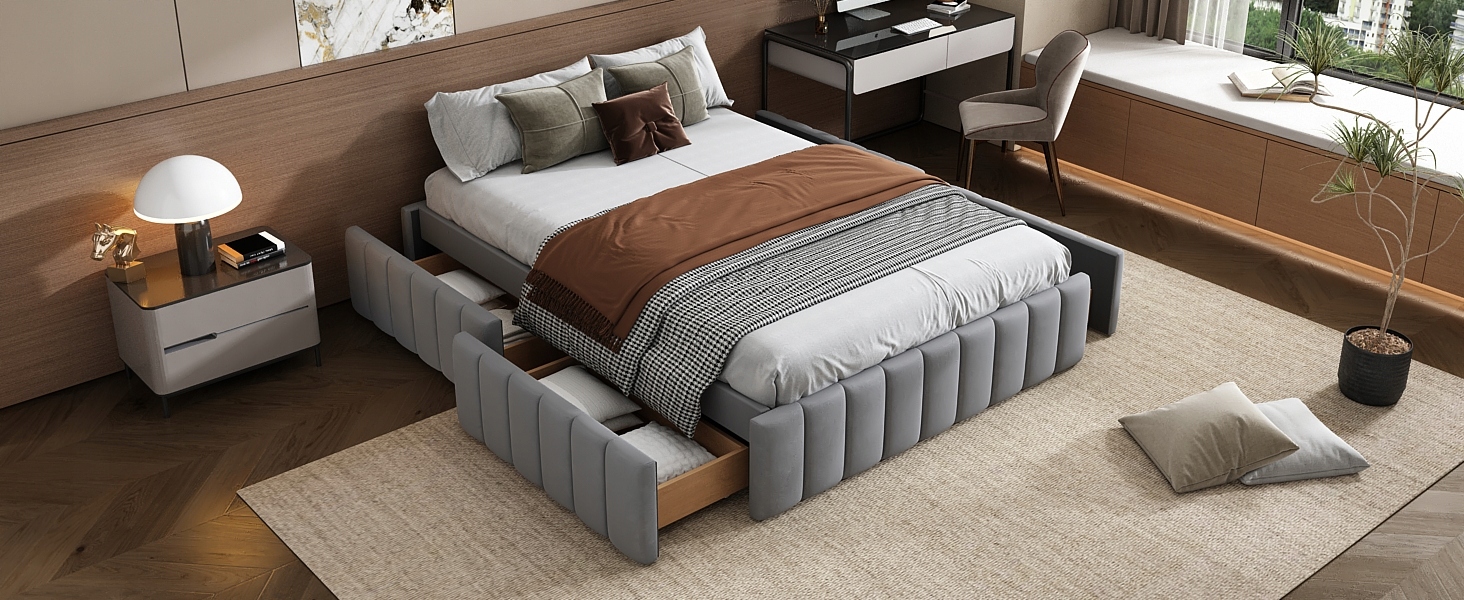 - Це сучасне плоске ліжко в мінімалістичному стилі виготовлено з добірного оксамиту та МДФ преміум-класу, щоб забезпечити довговічність і комфорт, а також якісне враження. Зовнішній вигляд простий і модний, підходить для різноманітних сучасних стилів. Чотири висувні ящики спрощують упорядкування та зберігання речей, а також залишаються охайними. Ліжко створює теплу та затишну домашню атмосферу, яка перетворює кожну перерву в задоволення.