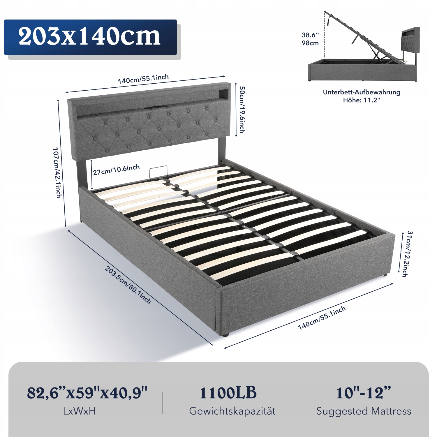 М'яке ліжко 140x200 см з підйомною рамою, контейнером для постільної білизни та USB-роз'ємом для зарядки
