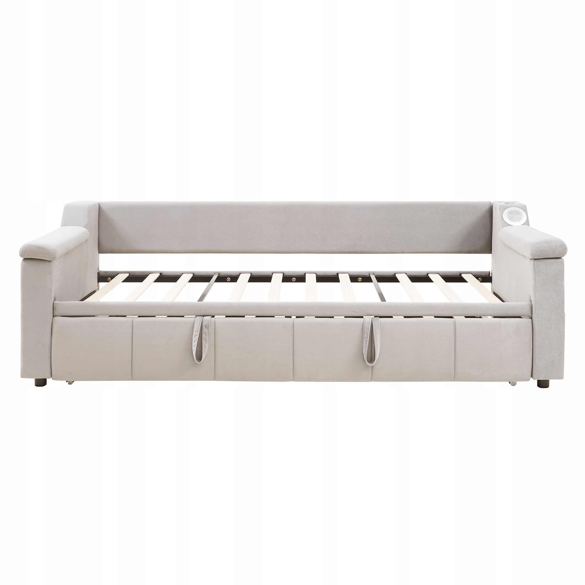 М'який диван з функцією сну, 90/180*190 см, ширші та товщі підлокітники, з інтелектуальною Bluetooth стереосистемою з USB-портом для зарядки, з відділеннями, з рейковим каркасом, оксамитова тканина, бежевий