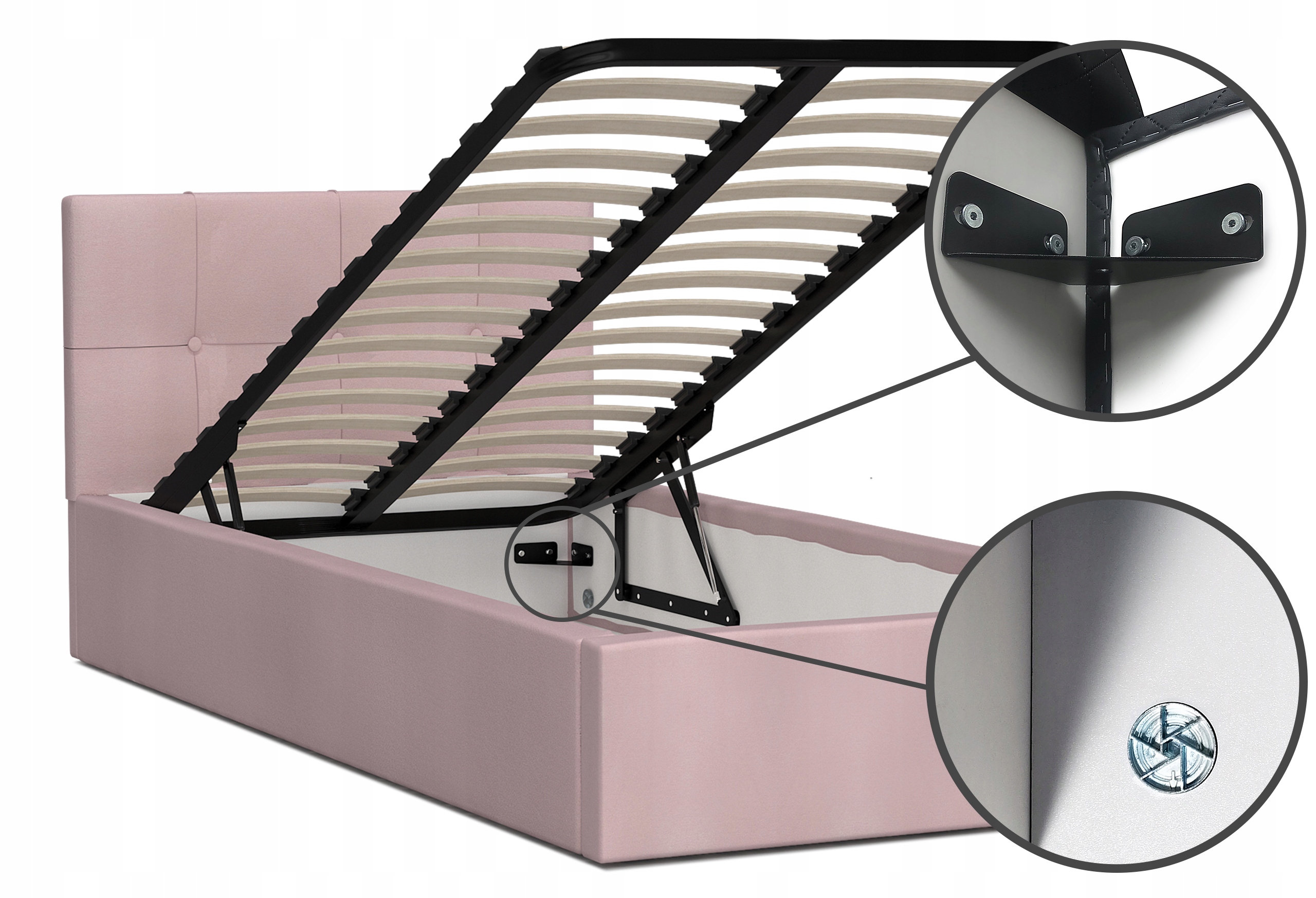 - Піднятий металевий каркас - Каркас підтримується підйомним механізмом - двома газовими балонами. Має пружні березові рейки, які працюють під тиском нашого тіла, кожна рейка поміщена в пластикову кишеню, завдяки чому ліжко не скрипить.