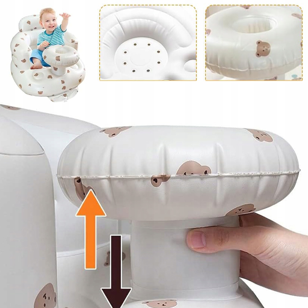 надувне сидіння з обгортковою конструкцією забезпечує стабілізацію спини, боків та ніг дитини, створюючи безпечне та комфортне сидяче середовище. Стілець можна легко надути за допомогою простого пресування, а після зливання повітря легке і легко зберігається.