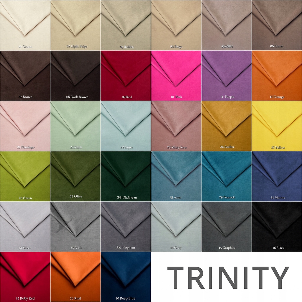 ➡️ Тканина Trinity можна прати. Структура матеріалу дозволяє видалити більшість забруднень шляхом: зливання, нанесення води або мильної води або протирання тканиною. Спеціальне покриття запобігає вбиранню рідини та полегшує збір рідкого бруду. Оббивна тканина Trinity приємна на дотик і ніжно переливається на світлі. Тканина виготовлена за технологією Cleanboo, яка обмежує поглинання рідин, напр. вода, кава, соки. Пролита рідина відразу утворює краплі та не проникає в тканину.