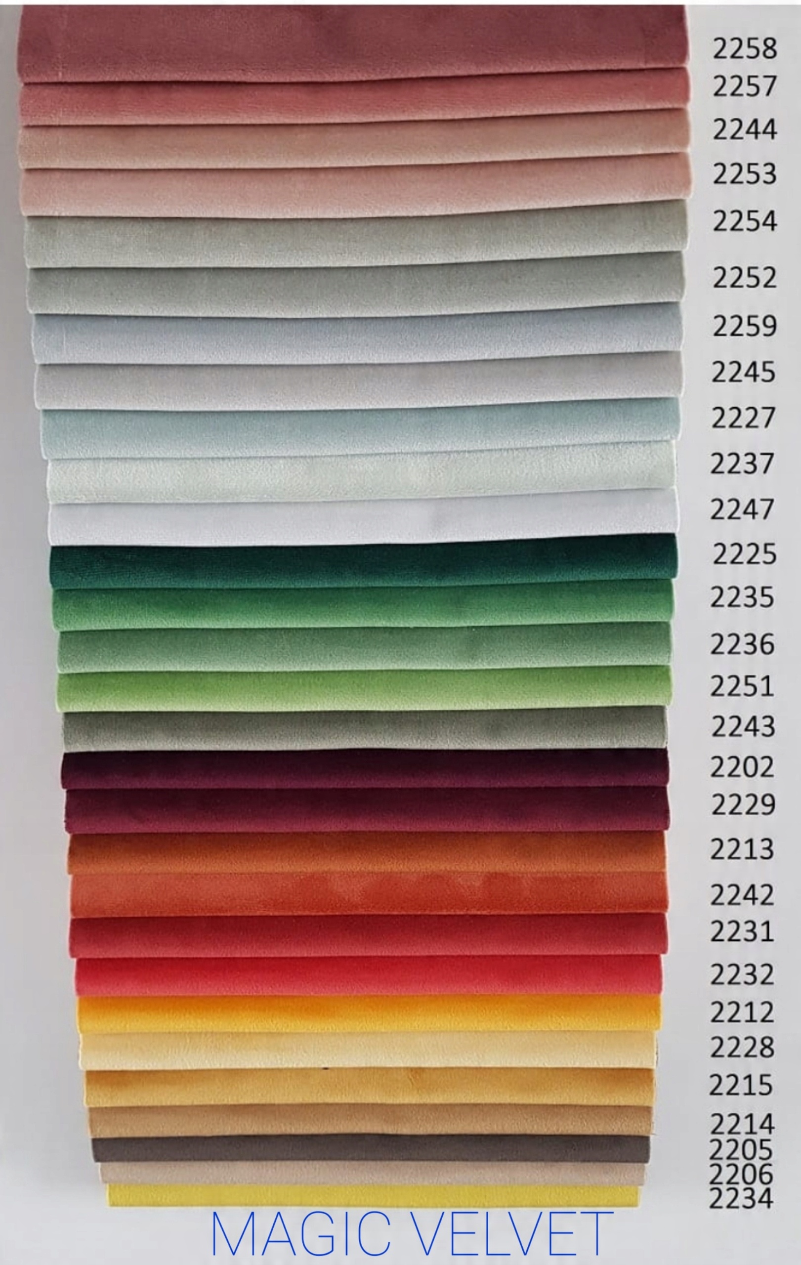Magic Velvet — одна з найяскравіших колекцій. Він пропонує соковиті кольори, які привнесуть багато енергії в інтер'єр, і величні відтінки синього, зеленого, рожевого і сірого. Використані кольори ідеально поєднуються з текстурою матеріалу, який приємний і м'який на дотик і має характерний для оксамиту блиск. Оксамитові тканини чудово виглядають на м'яких меблях і декоративних аксесуарах. Крім того, колекція Magic Velvet має високу стійкість до пиллінгу та вицвітання, що означає, що тканина збереже свої естетичні цінності протягом тривалого часу.