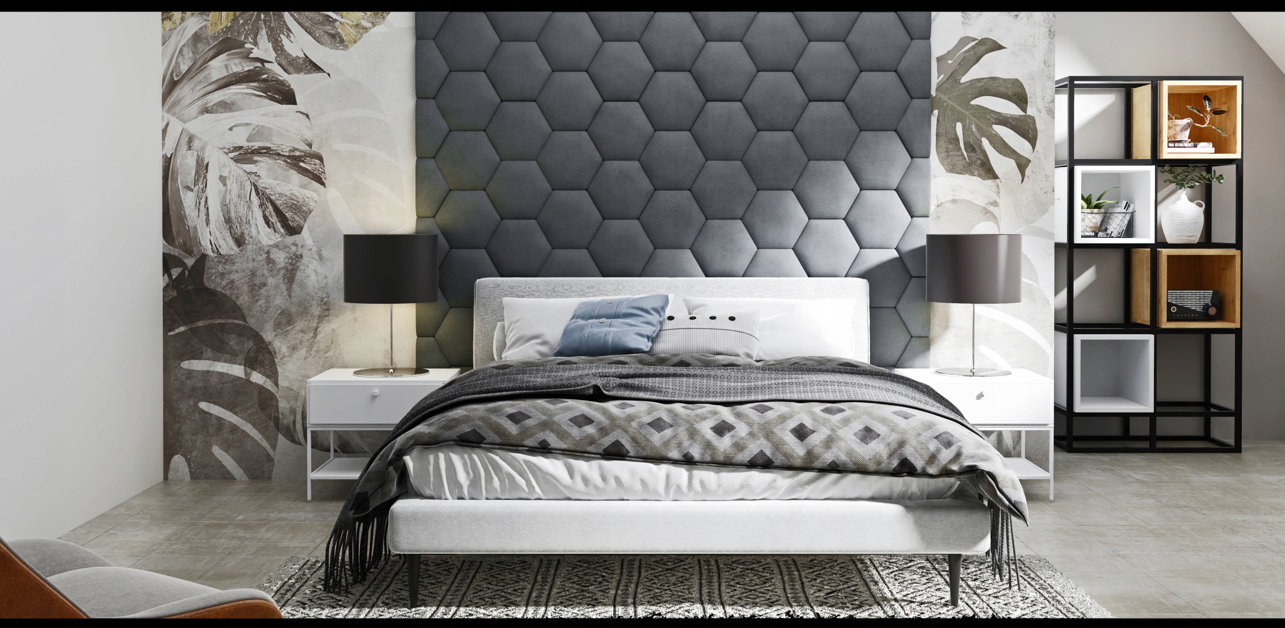 Панель оббивки - КОЛЕКЦІЯ HEXAGON - м'які панелі незмінної, чудової форми - характеризуються форма, що нагадує стільники або шестикутник. Вони чудово впишуться в різноманітні композиції, як для дітей, так і для дорослих. Ми можемо створити власний дизайн, враховуючи розташування панелей у різних композиціях - завдяки чому ми надамо йому індивідуальний/неповторний стиль.