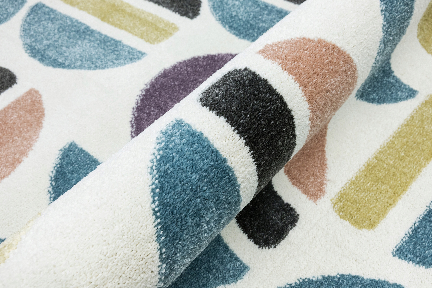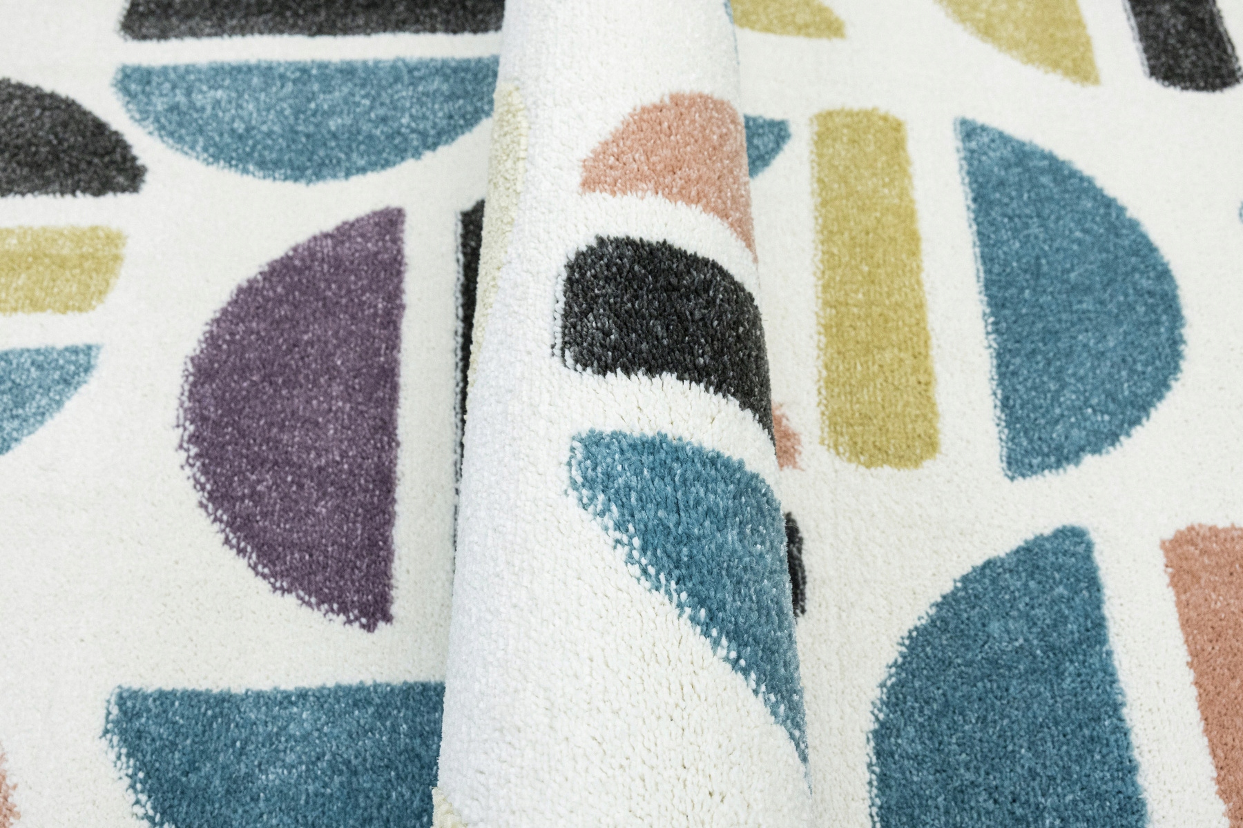 Дитячий килимок з колекції Lima прикрашений геометричним малюнком із півкіл та прямих смуг, які створюють ритмічне та гармонійне розташування. До яскравих і позитивних кольорів можна віднести кремовий фон і елементи контрастних, злегка пастельних відтінків фіолетового, рожевого, блакитного, жовтого і графітового. Світла палітра кольорів і злегка блискучий м'який фліс створюють модне і практичне доповнення до облаштування дитячих кімнат.
