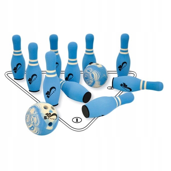 10 кеглів 29 см, 2 кулі для розбивання діаметром 16 см, їх і килимки з нанесеним на них малюнком, згідно з яким повинні бути розміщені кеглі. Боулінг тренує загальну моторику. Дбайливо виготовлено з твердого поролону.