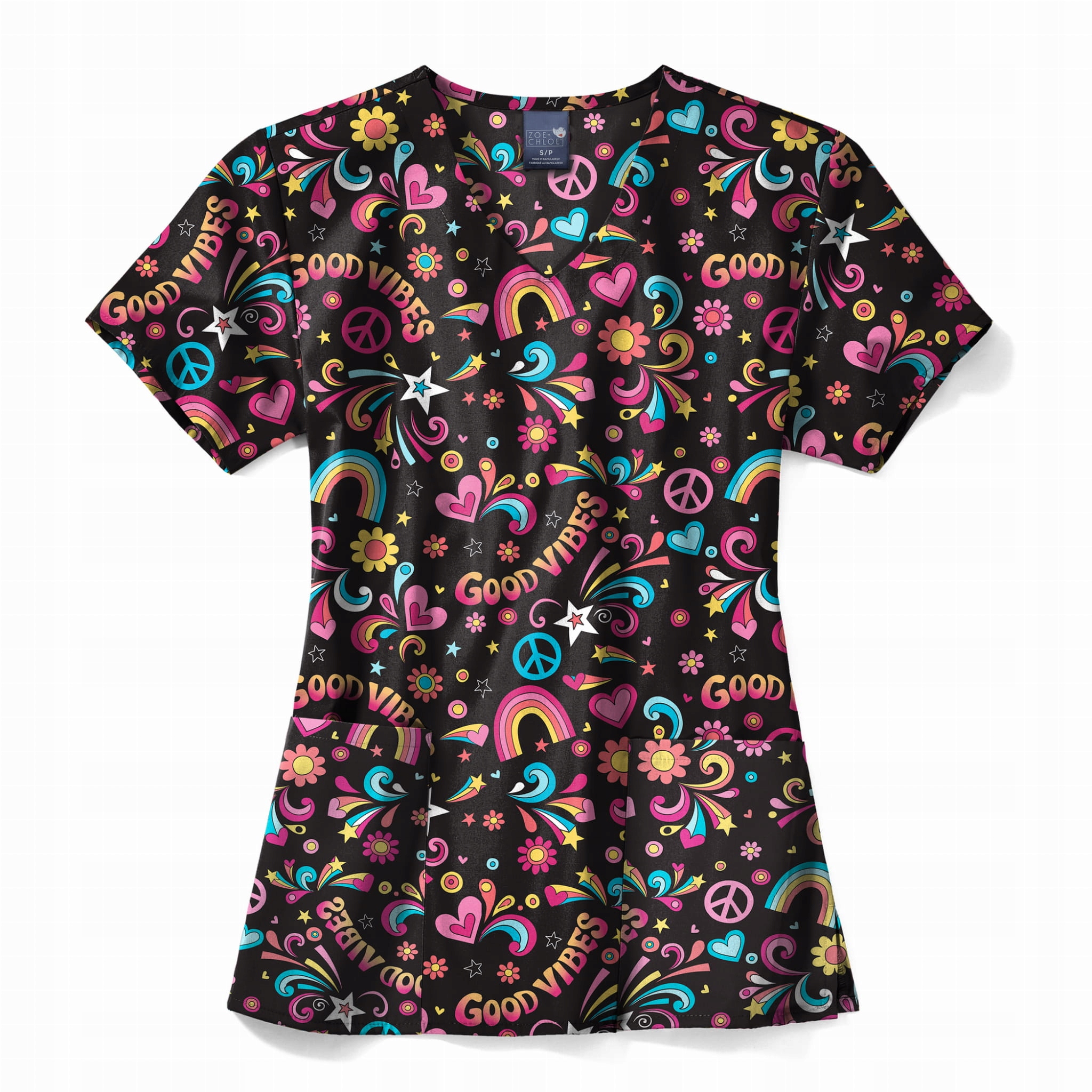 Чорний світшот із струмуючого, еластичного та холодного матеріалу перенесе вас на найкращий фестиваль у світі. Різнокольорові веселки, пустушки, квіти з переважанням рожевого кольору, написи good vibes - ось що заспокоїть ваші роздратовані нерви під час напруженої зміни. Це дозволить вам відновити гарну енергію - адже в світшоті складно не почуватися комфортно. Матеріал дихає, охолоджує і тече - тому марафони у відділенні будуть не страшні. Медичний світшот Good Vibes дуже швидко сохне, легко переться і не потребує прасування. У двох містких кишенях помістяться всі необхідні для роботи речі. Бічні розрізи ідеально розташують форму на лінії стегон, а V-подібний виріз стягне шию