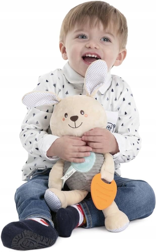 На лапці зайчика прикріплена підвіска у формі моркви, яку можна використовувати як прорізувач для зубів, забезпечуючи чудову підтримку під час прорізування зубів.