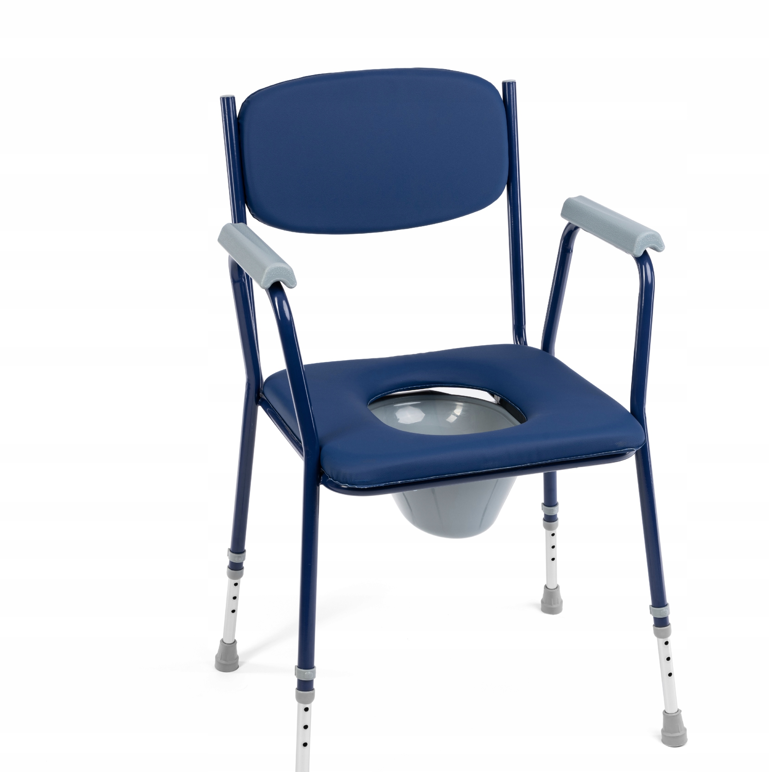 Туалевий туалетний стілець із синього-куточка-це допоміжне обладнання, яке полегшує користувачеві гігієни. Це рекомендується людям, які мають проблеми з незалежним рухом, з дисфункціями та обмеженнями руху, і для людей, які втратили здатність сісти і вставати самостійно. Стілець має туалетну функцію завдяки обладнанню з санітарною контейнером під сидінням. Сприяє користувачеві та турботі про фізіологічні та догляд за діяльністю користувача. Підлокітники підтримують стабільність та безпеку використання,