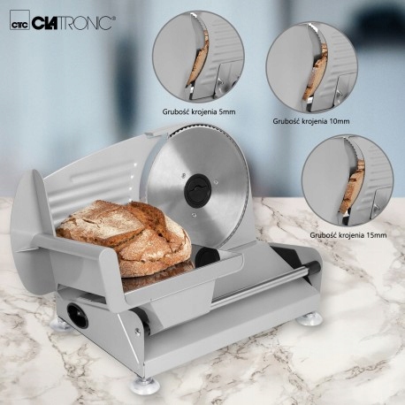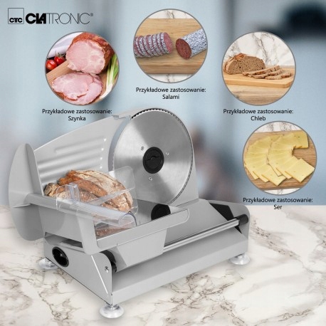 Якісний електричний слайсер Clatronic MA 3585 для хліба, м'ясної нарізки, сиру та овочів полегшить щоденне нарізання харчових продуктів на рівні та прямі скибочки відповідної ширини. Ви можете нарізати свіжий хрусткий хліб на рівні скибочки, а нарізати шинку чи сир тонкими скибочками більше не буде проблемою