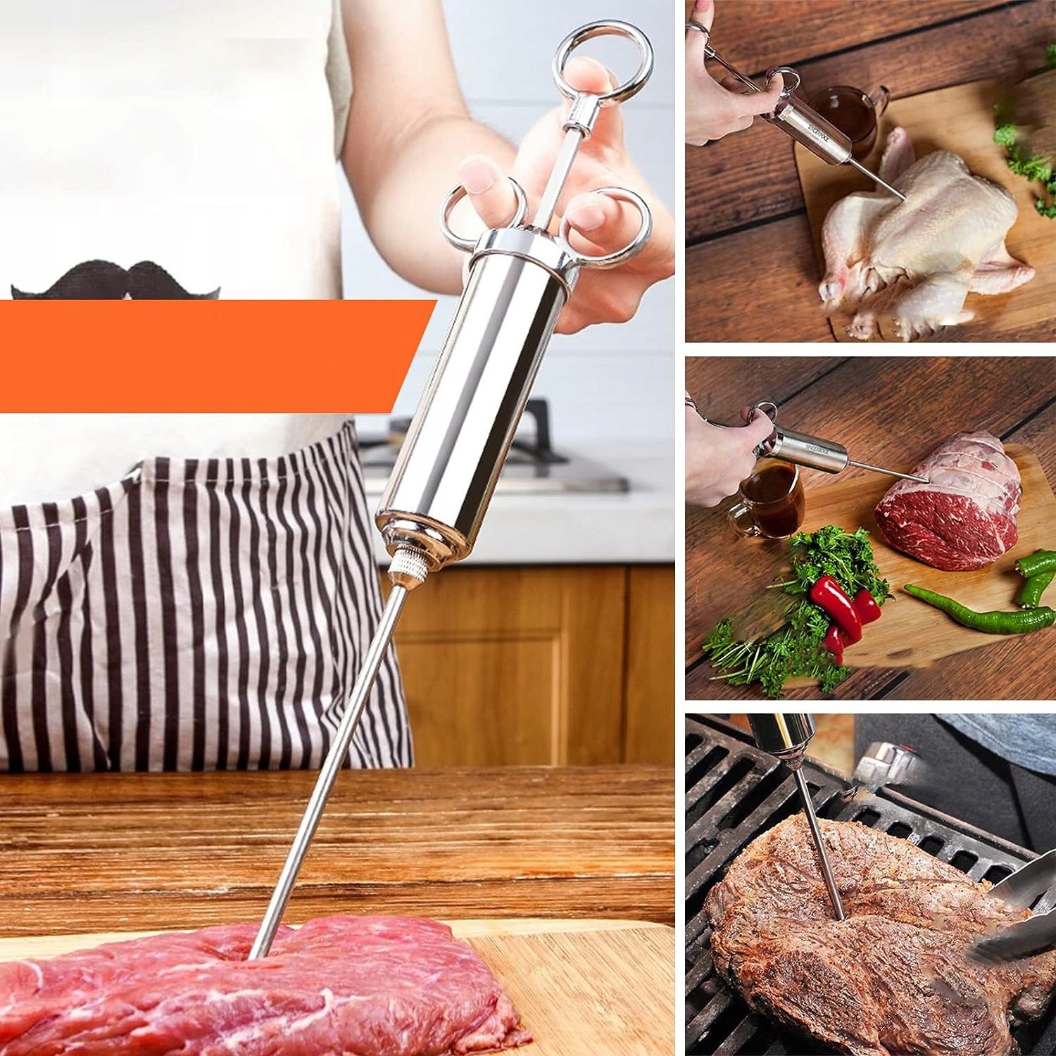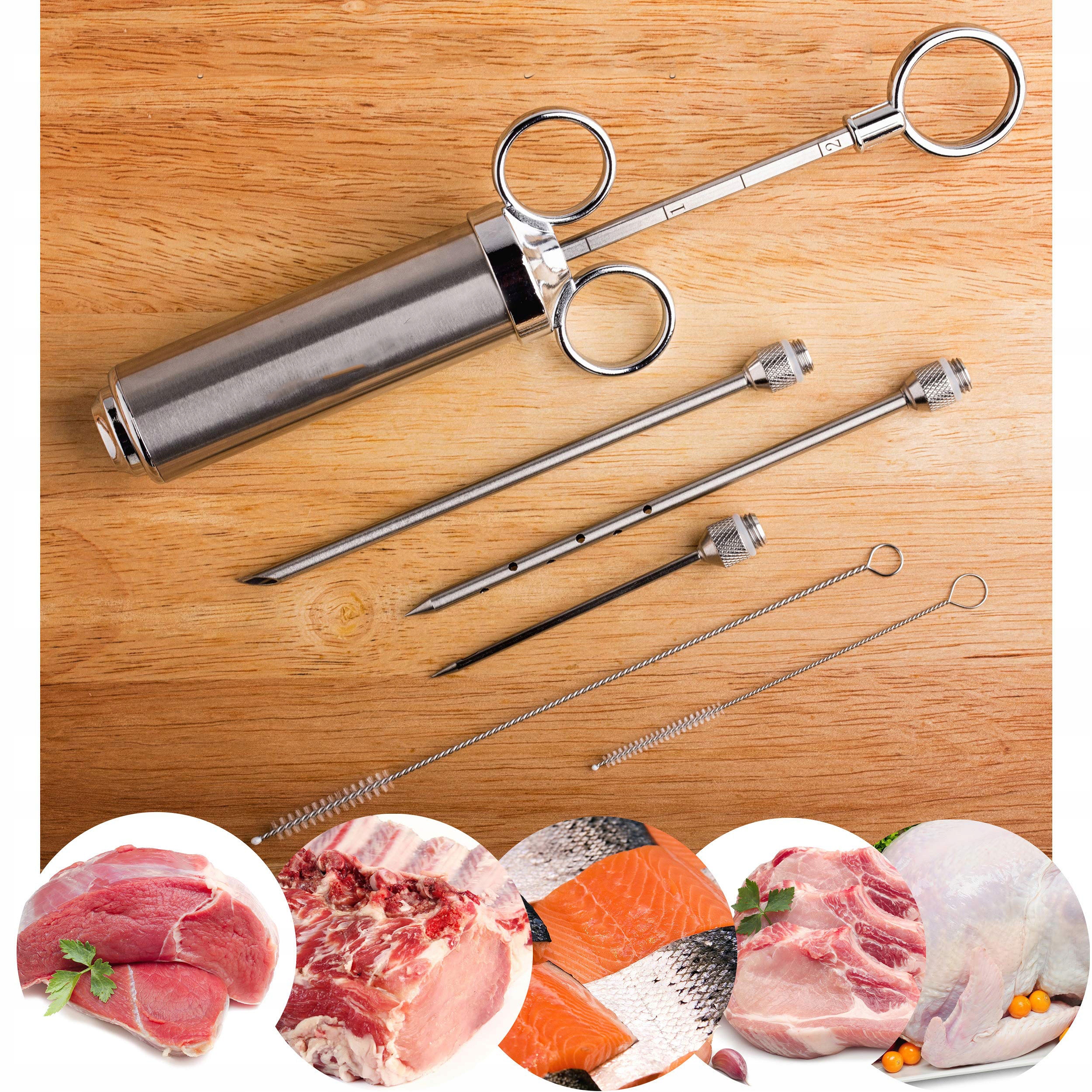 Ін’єкції м’яса – це техніка, яка економить час і простір, яка щоразу забезпечує вологе та ароматне м’ясо. Виготовлений з високоякісної нержавіючої сталі, смаковий інжектор є професійним інструментом, який допоможе вам створювати смачні м’ясні страви.